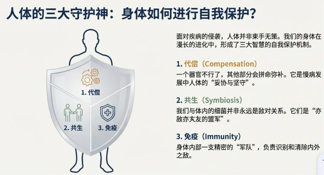 大多数症状是人类进化带来的智慧,是对疾病的提醒和对人体的自我保护机制:包括代偿、共生、免疫系统。