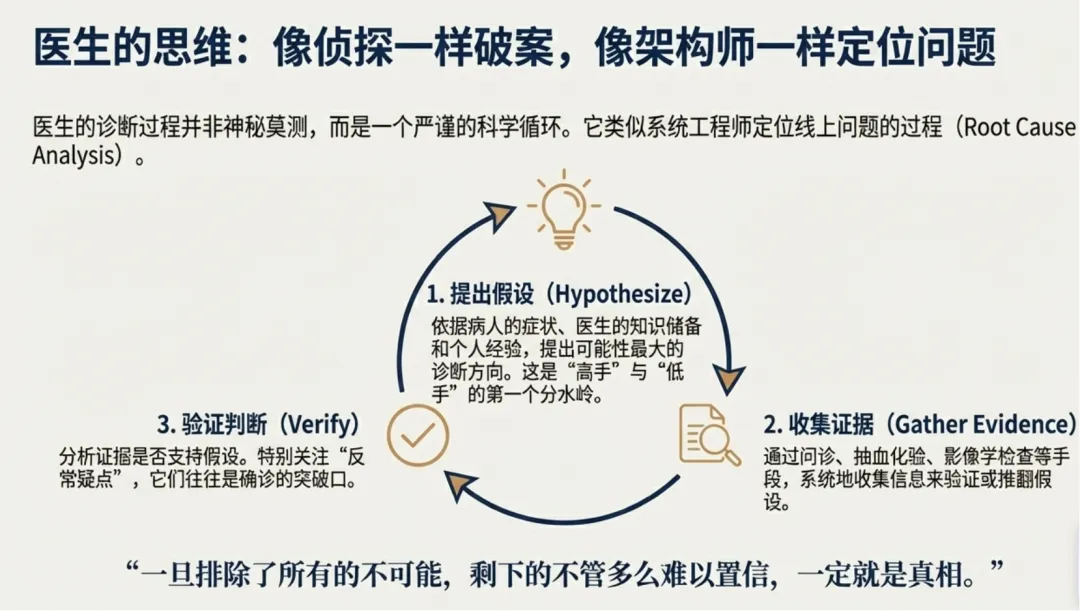 提出假设,小心求证的诊断思维模式,不仅是医生诊断的科学逻辑,也是一种为求真而上下求索的态度,是解决任何问题都需要的。为什么医生都在努力精进,成为高手?因为在生命面前,没有人会容受平庸。