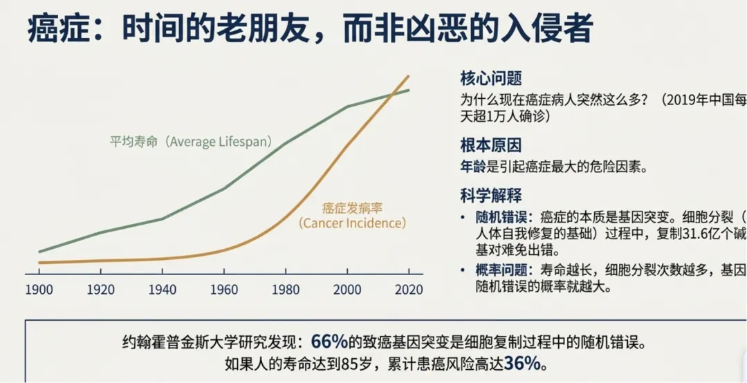细胞分裂人体一种自我修复机制多细胞生物生存基础随机错误就是细胞分裂带来细胞分裂时候需要复制染色体然后染色体里面遗传基因平均分配两个新细胞里。人的染色体31.6亿碱基对细胞每次分裂复制31.6一个碱基对工作量难免出错(随机错误)错误不断累积就可能在关键位点突变癌症基因。寿命越长,细胞分裂次数越多,基因出现随机错误的概率越大,如果人的寿命达到85累计风险高达36%发达国家人均寿命更长癌症发病率更高