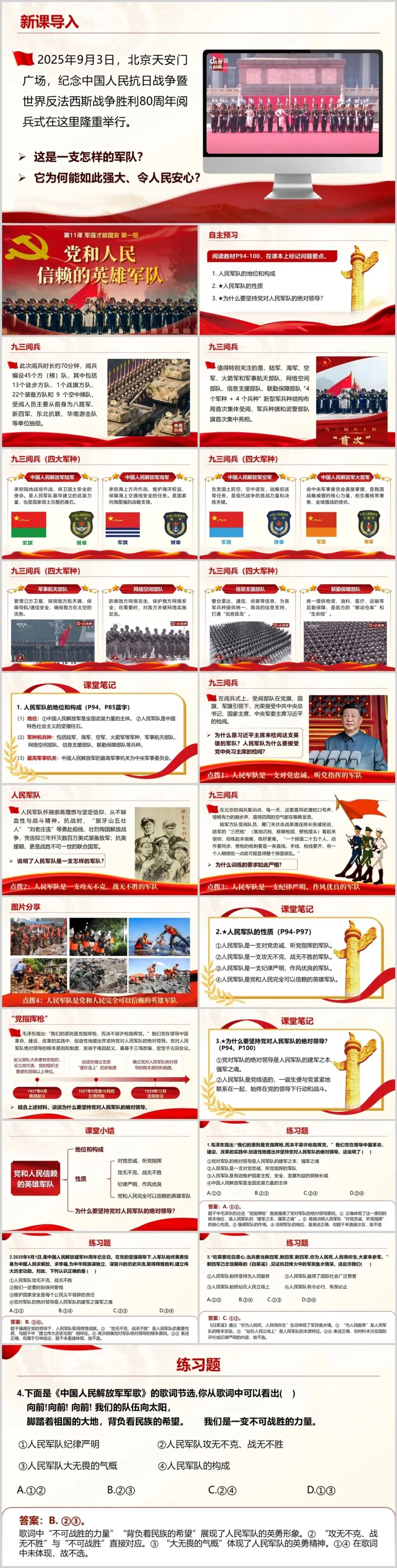 本期【会员群】更新课件11.1《党和人民信赖的英雄军队》,本次课件内容是统编版道德与法治八年级上册第二单元第十课第二框,共24页,建议教学时长为1课时。