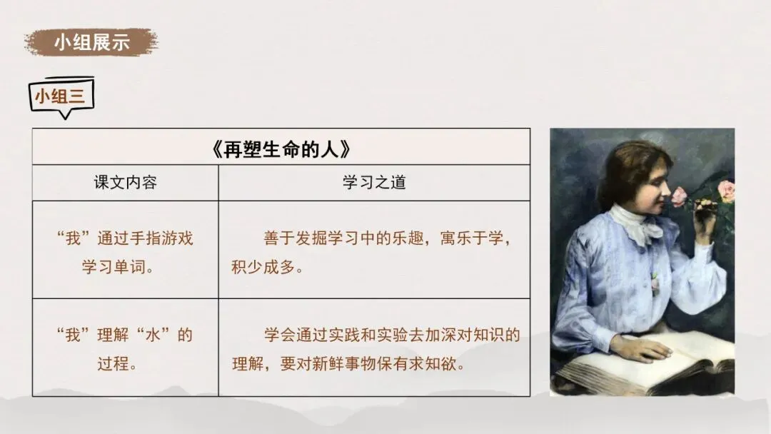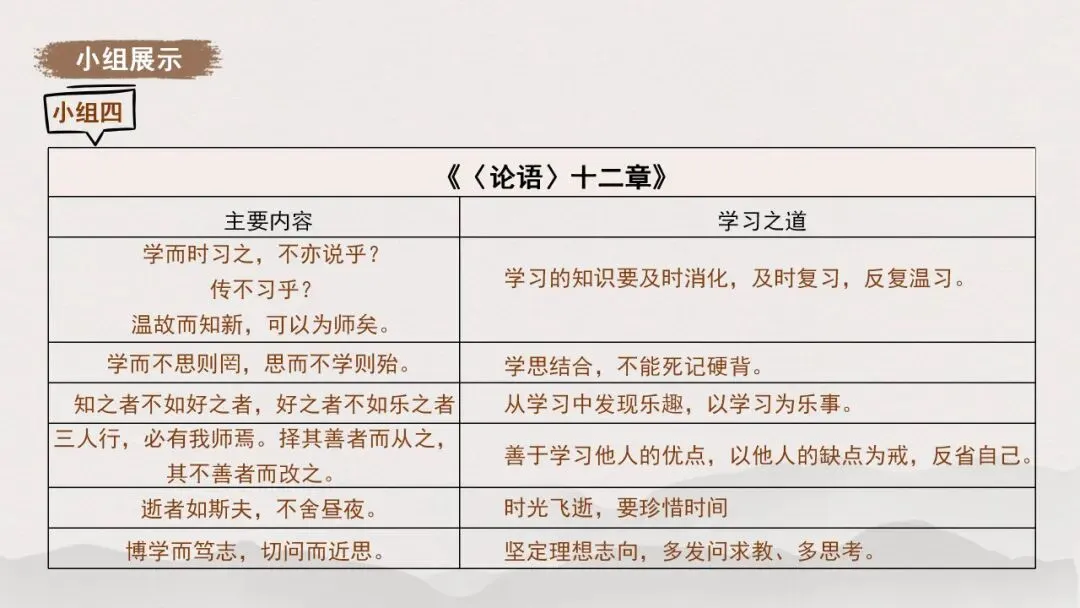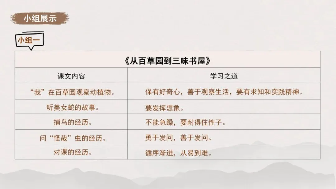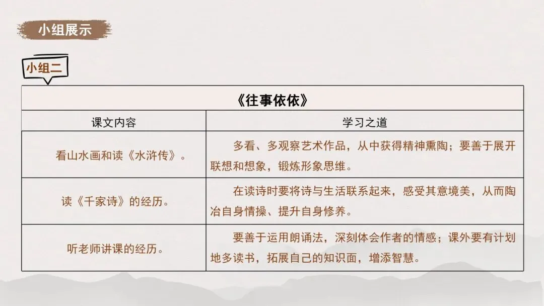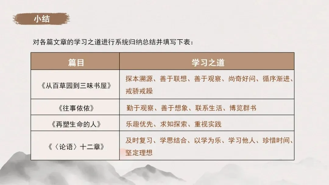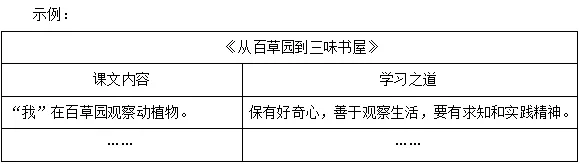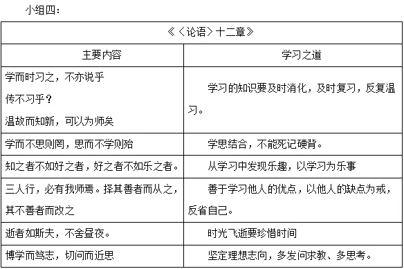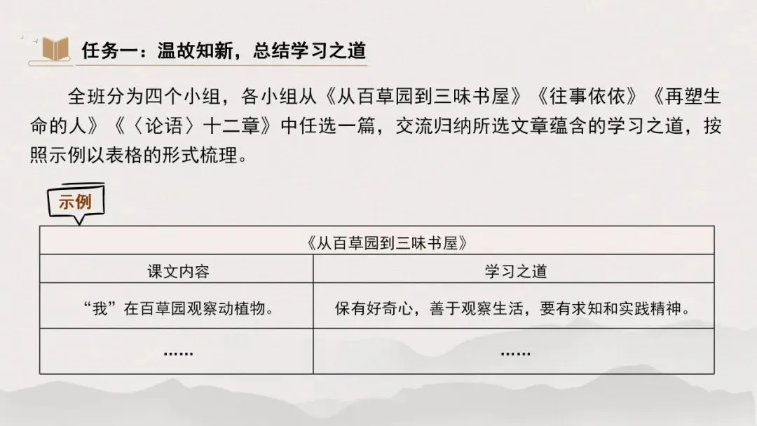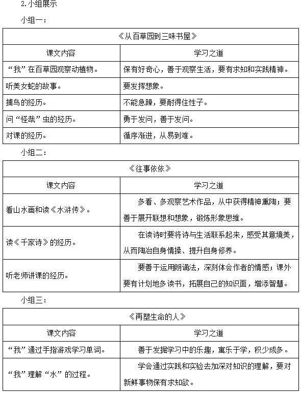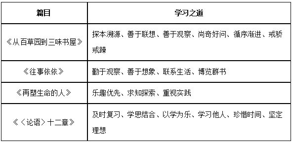 1.全班分为四个小组,各小组从《从百草园到三味书屋》《往事依依》《再塑生命的人》《〈论语〉十二章》中任选一篇,交流归纳所选文章蕴含的学习之道,按照示例以表格的形式梳理。
