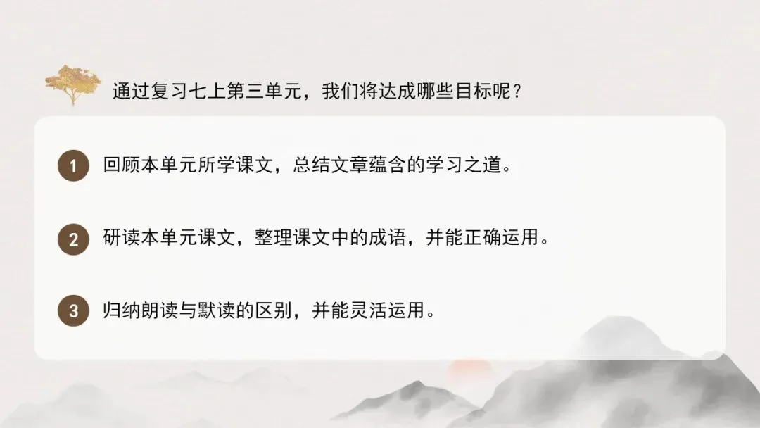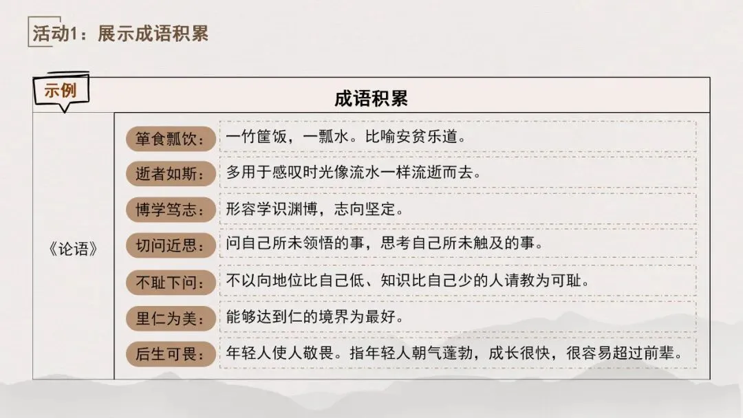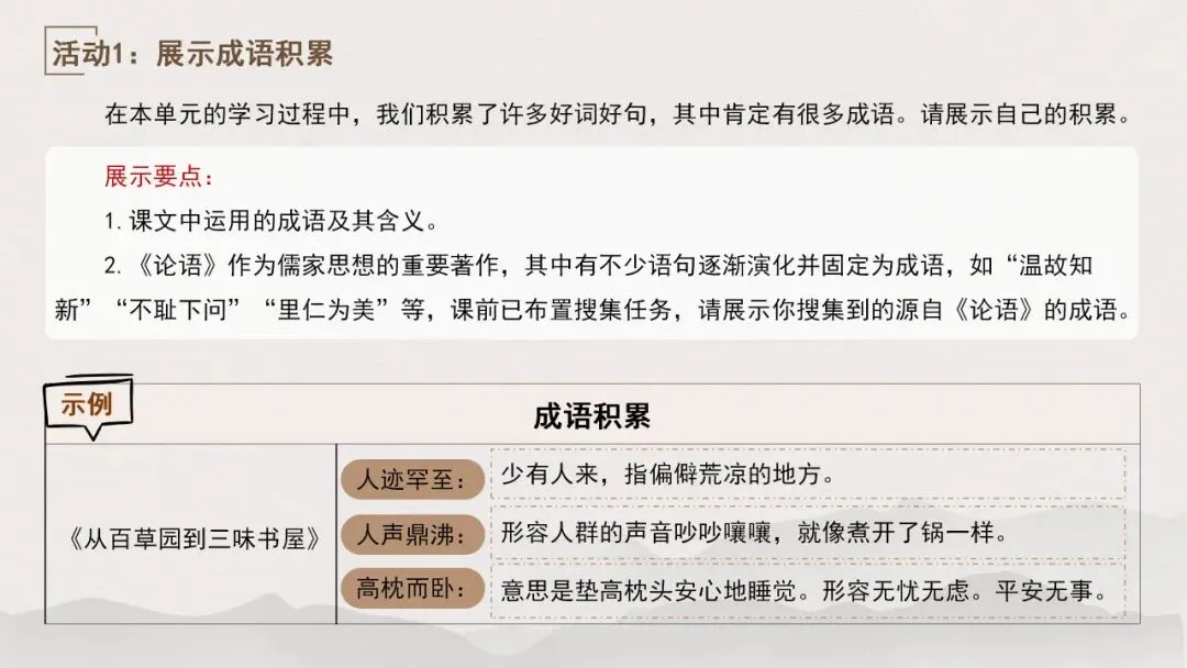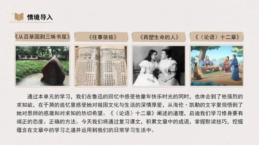 通过本单元的学习,我们在鲁迅的回忆中感受他童年快乐时光的同时,也体会到了他强烈的求知欲,在于漪的追忆里感受她对祖国文化与生活的深情厚爱,从海伦·凯勒的文字里领悟到了她对恩师的感激和对求知的热切希望。《〈论语〉十二章》阐述的道理,启迪我们学习修身要有端正的态度、正确的方法。今天我们将通过复习课文,积累文章中的成语,掌握默读技巧,挖掘蕴含在文章中的学习之道并运用到我们的日常学习生活中。