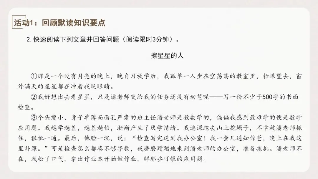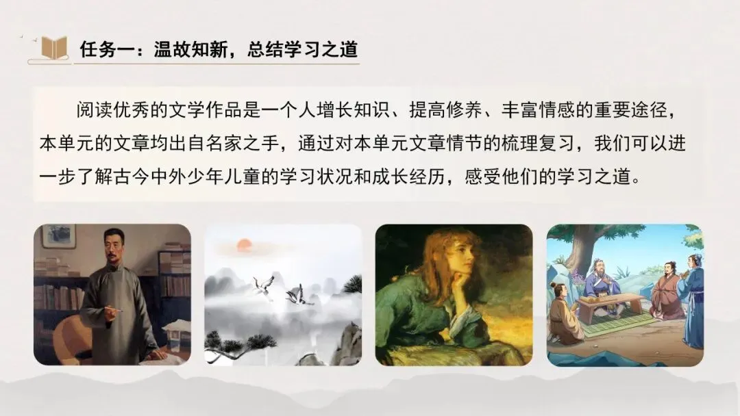 阅读优秀的文学作品是一个人增长知识、提高修养、丰富情感的重要途径,本单元的文章均出自名家之手,通过对本单元文章情节的梳理复习,我们可以进一步了解古今中外少年儿童的学习状况和成长经历,感受他们的学习之道。