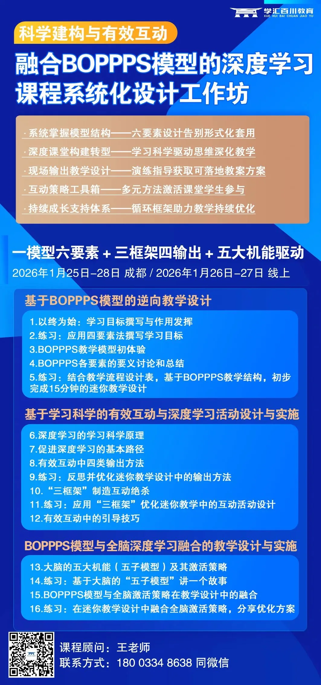 【1月25日-1月28日•成都】科学建构与有效互动:融合BOPPPS模型的深度学习课程系统化设计工作坊
