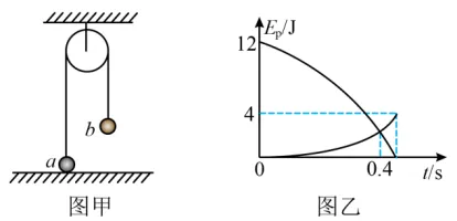 **变式 [攻坚] **(多选)如图甲,可视为质点的、两球通过轻绳连接跨过光滑轻质定滑轮,球在外力作用下静止悬空,以所在的地面为重力势能的零势能面。从静止释放球,在球落地前的过程中,、两球的重力势能随时间的变化关系如图乙,图中两图像交点对应时刻,球始终没有与定滑轮相碰,、始终在竖直方向上运动,忽略空气阻力,取。则( )