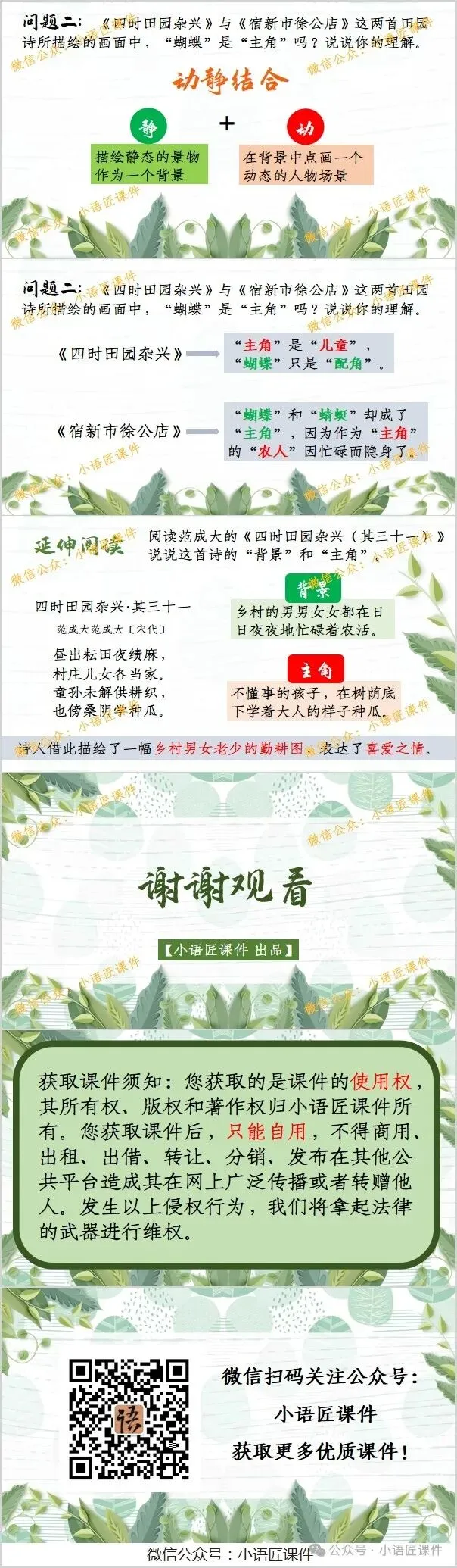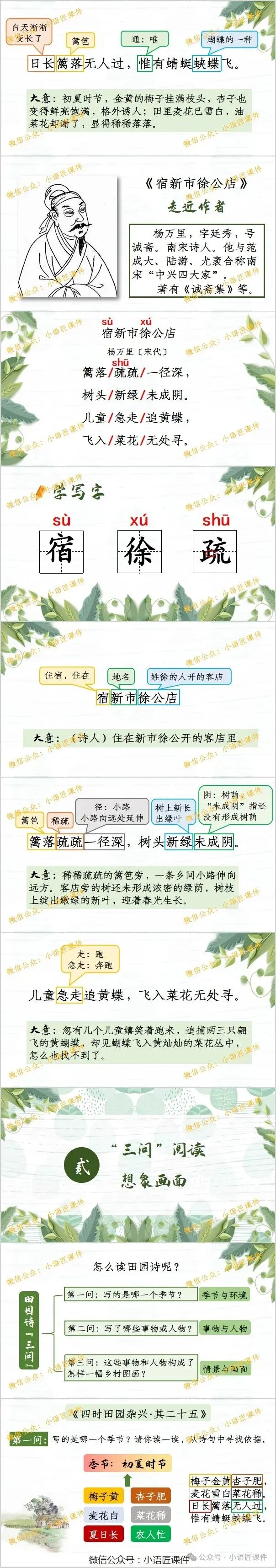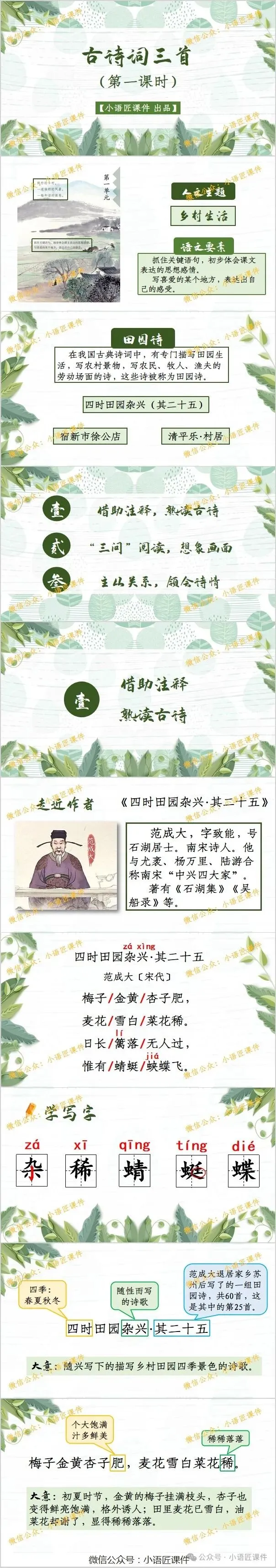 大家好,我是小语匠课件!今天给大家分享四年级下册《四时田园杂兴·其二十五》《宿新市徐公店》《古诗词三首》(第1课时)的独家课件。