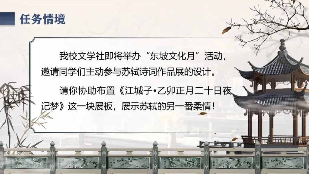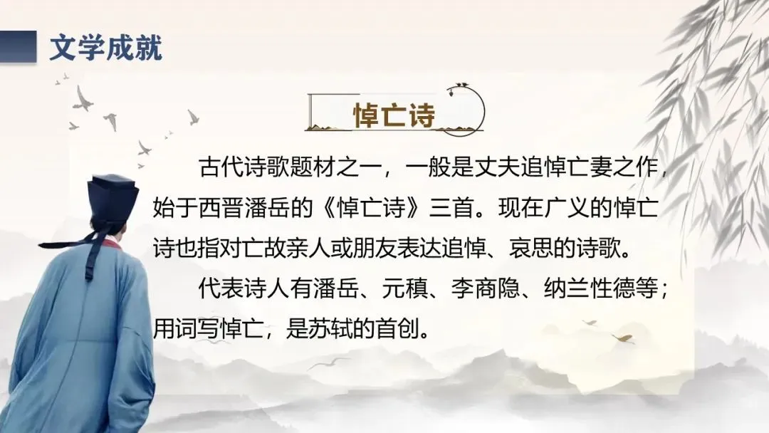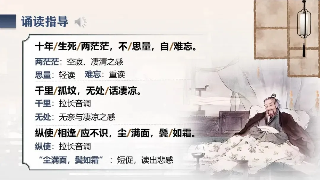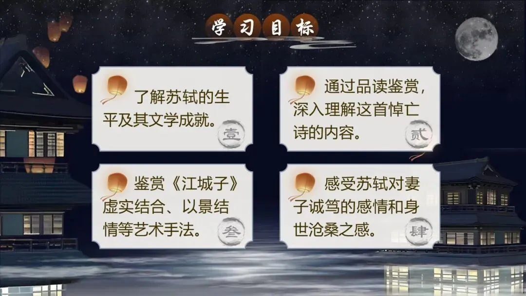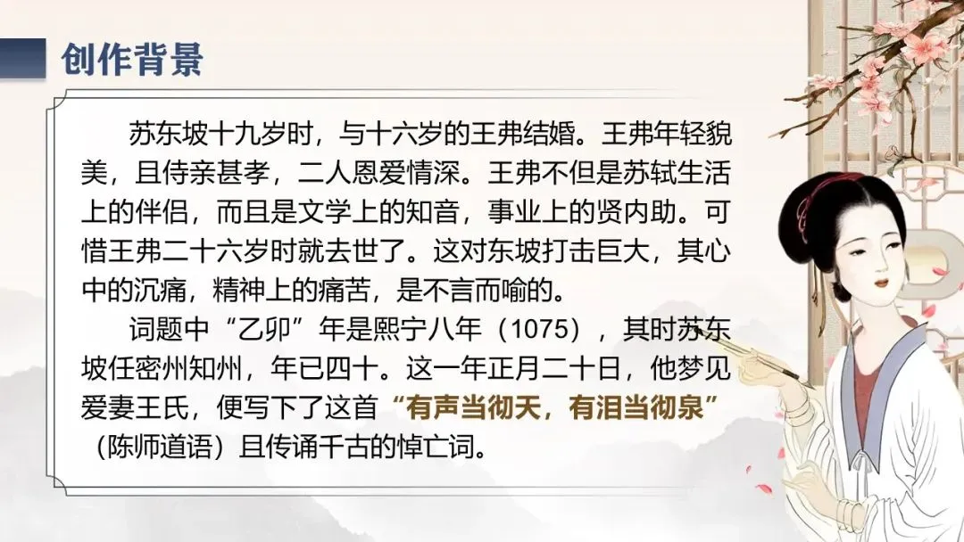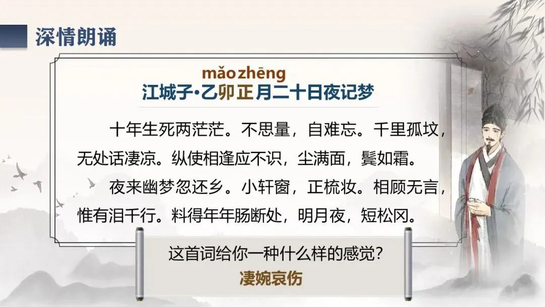 《江城子·乙卯正月二十日夜记梦》,是苏轼纪念亡妻王弗的首词作。词题虽为记梦,实际是通过记梦来抒写对亡妻真挚的爱情和深沉的思念。全词感情深挚,充满了凄婉哀伤的调子。