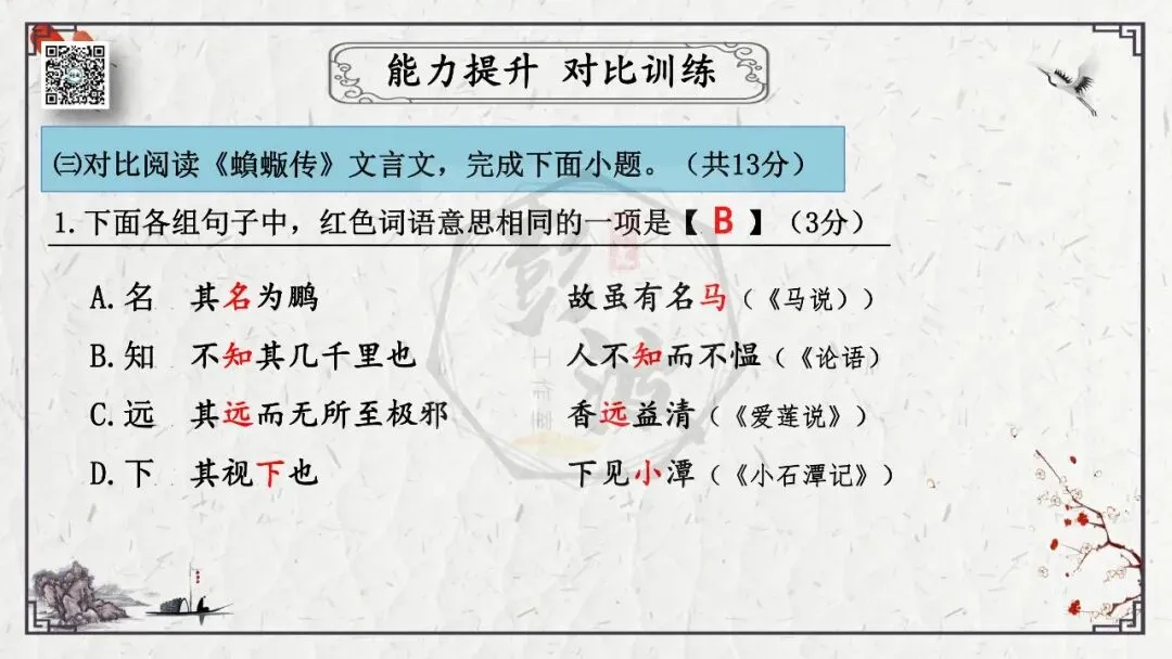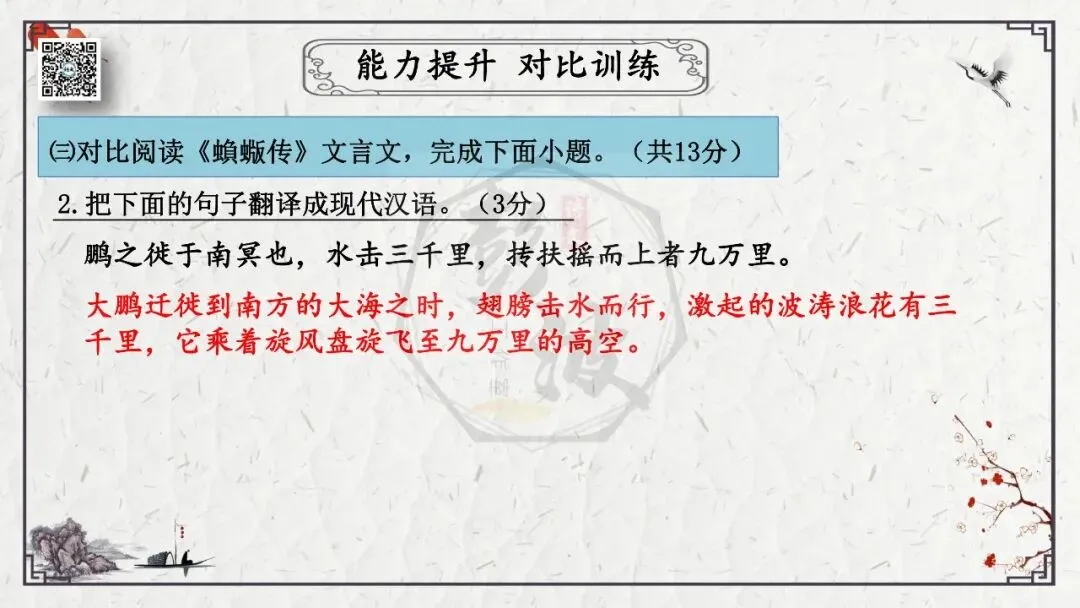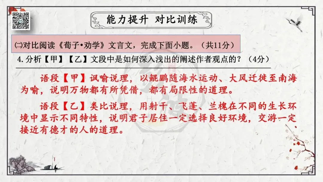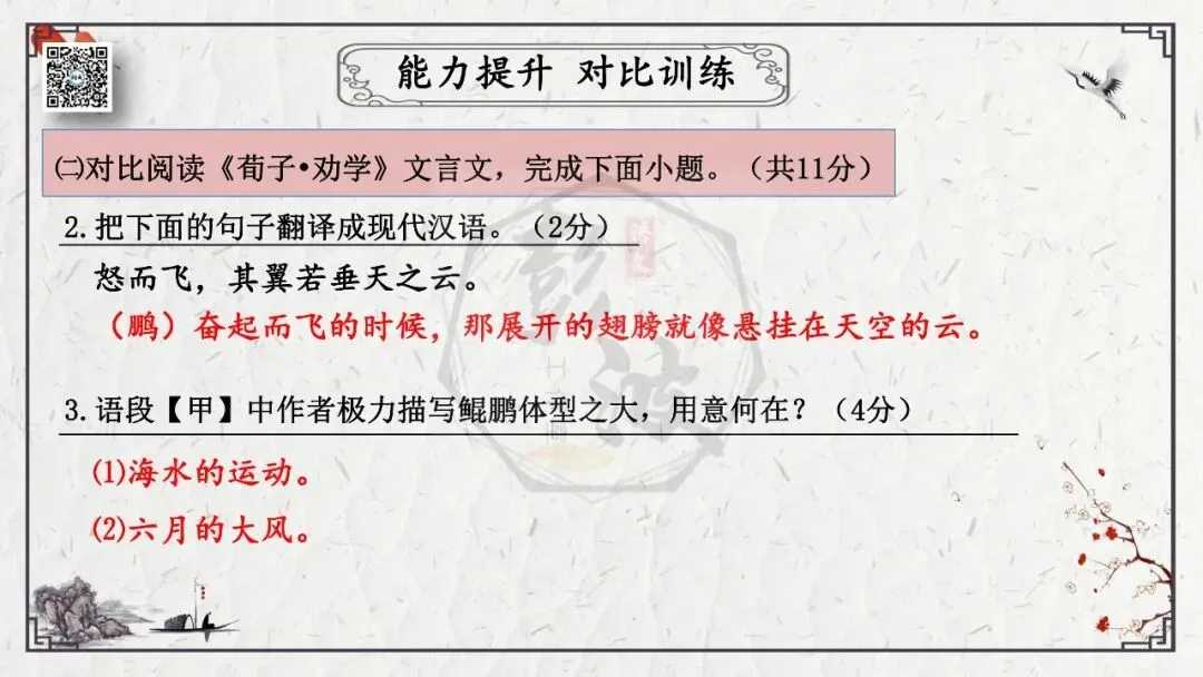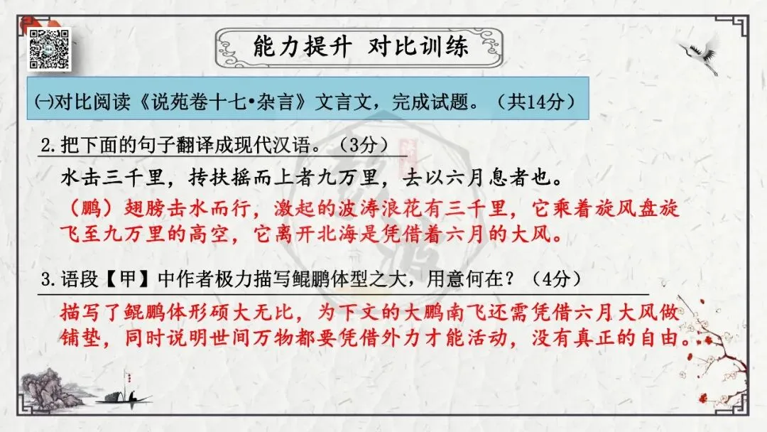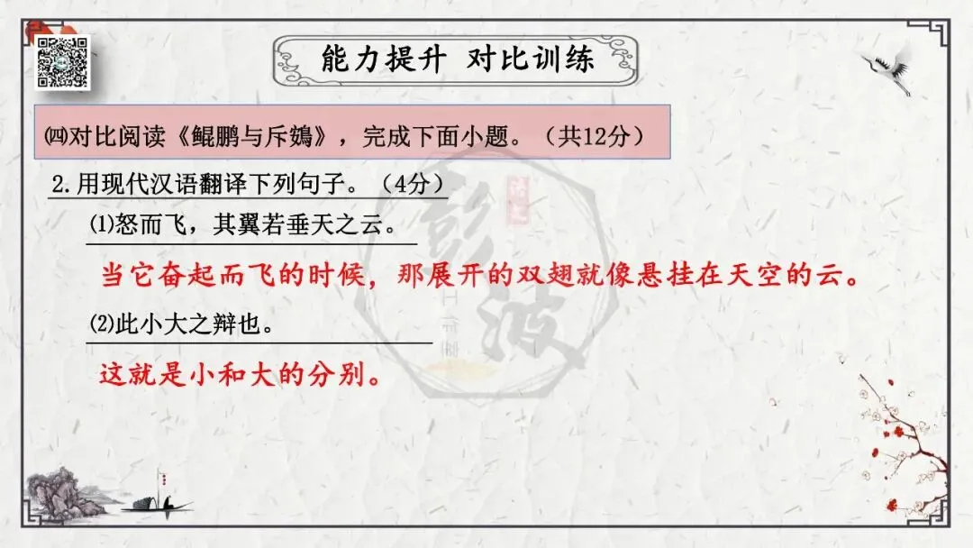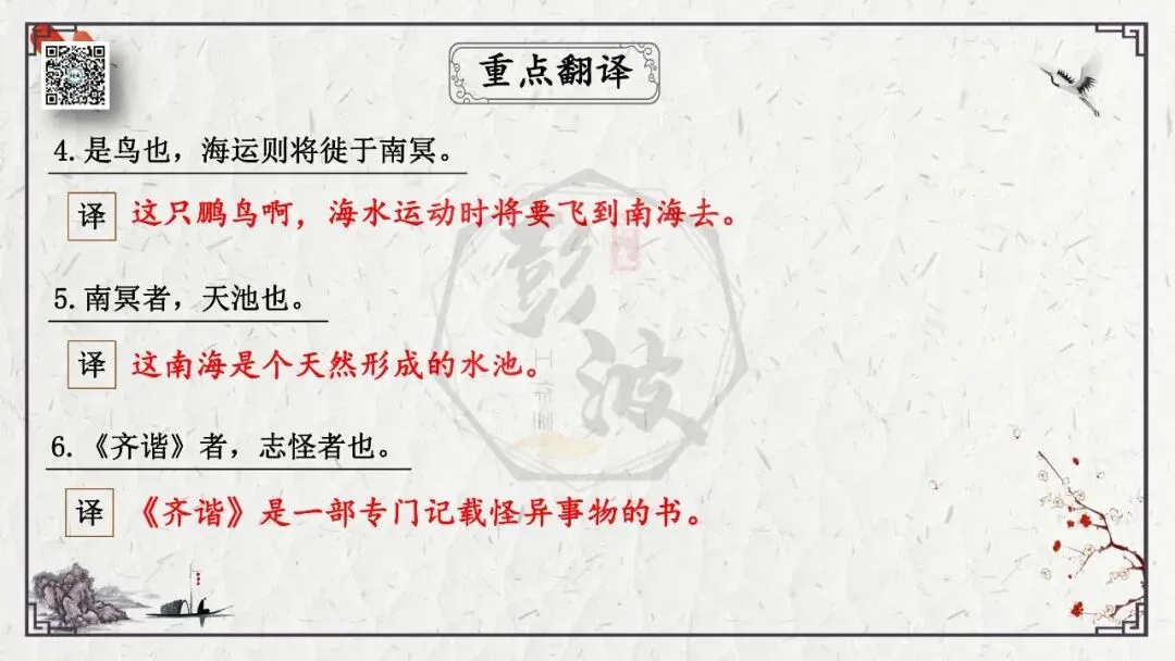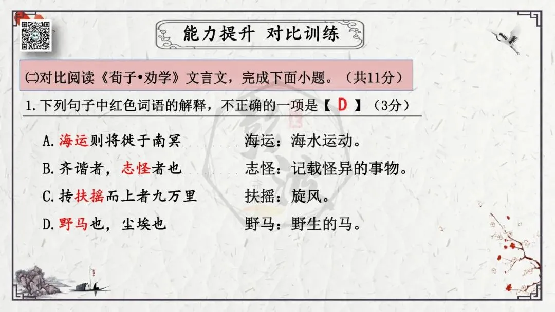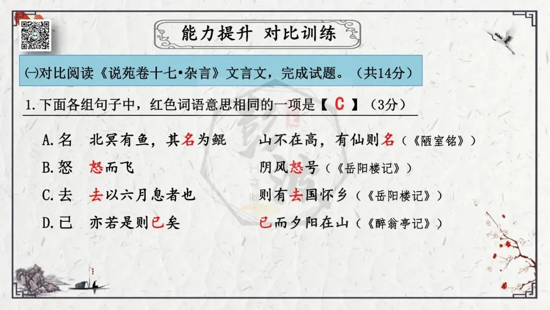 解读:①注重积累文言实词和虚词的意义、用法,积累特殊句式等。如翻译句子就是对常见文言实词、虚词、句式、语气的辨析,是识记、理解、分析的综合运用。②在理解词句的基础上,能概括出文章内容,能够对文意进行简单地分析,弄清作者抒发的感情或表达的观点,并能从中获得自己的独特感悟。