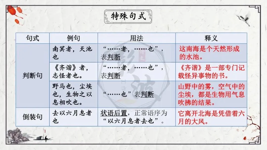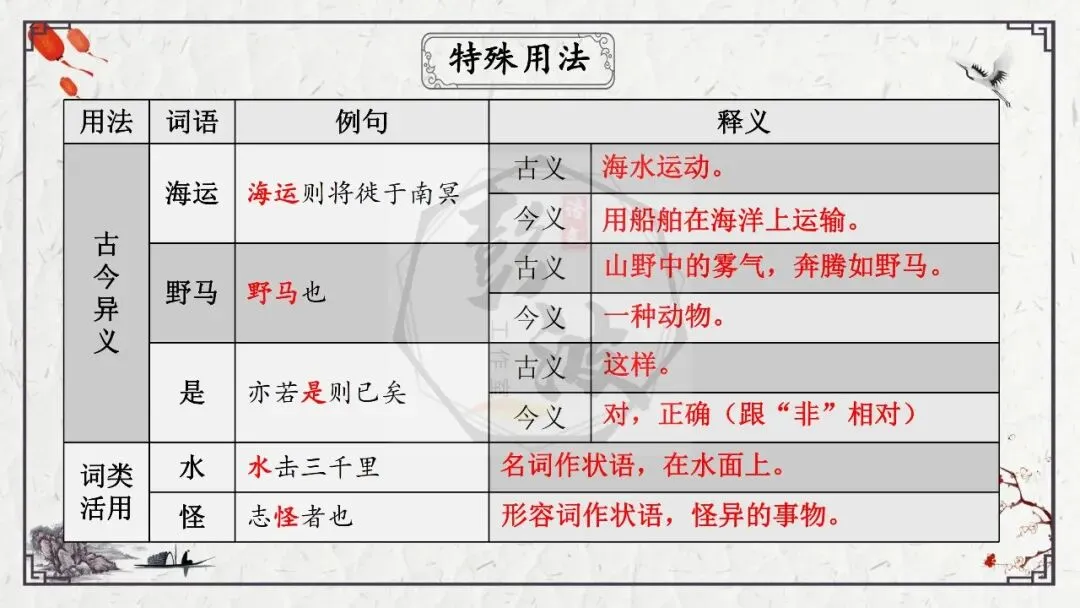 4.除此之外,课标中“随文学习基本的词汇、语法知识,用来帮助理解课文中的语言难点;了解常用的修辞方法,体会它们在课文中的表达效果”,即要求在随文学习中要掌握文言文实词、虚词、语法、修辞、句子翻译、文意理解、语言赏析等知识点。