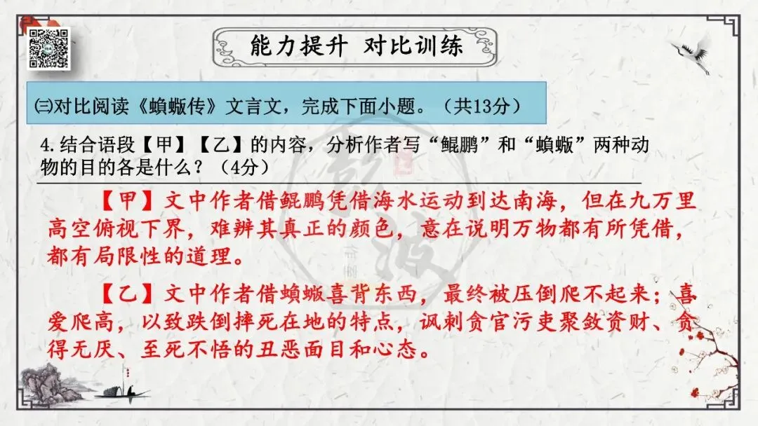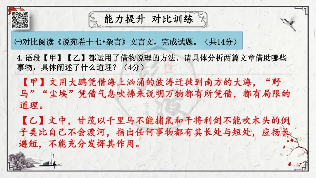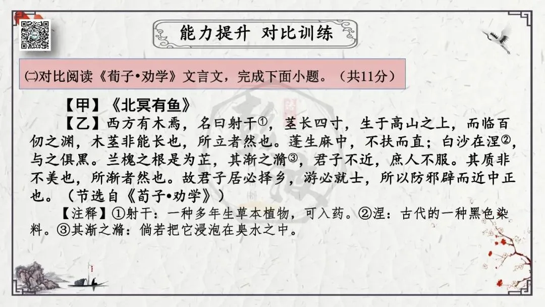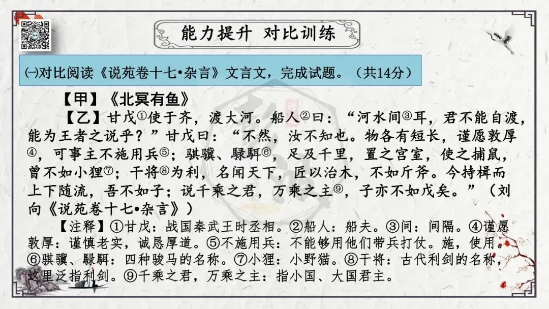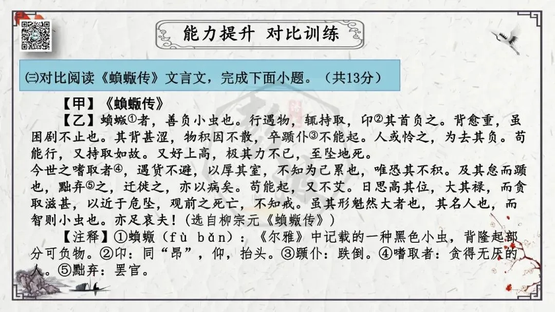 对应考点:①理解常见文言实词在具体语境中的含义。②理解常见文言虚词在具体语境中的意义和用法。③理解并翻译句子。④断句。⑤理解文章的基本内容,分析归纳文章内容要点。⑥分析概括文章所表达的作者的观点或态度。⑦对文章的内容、语言、写法有自己的体会和见解。⑧分析探究链接材料。