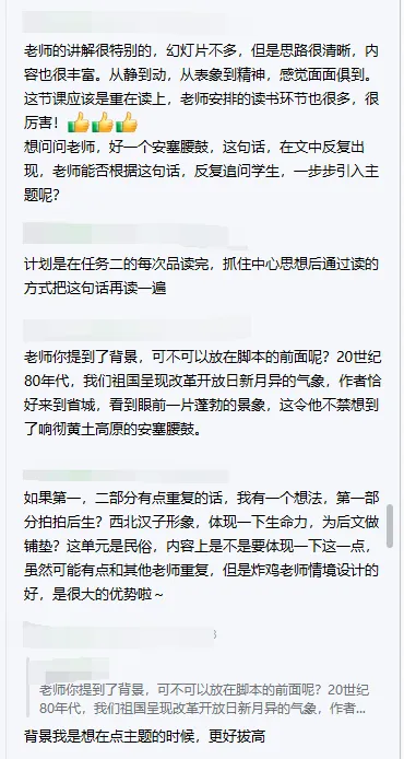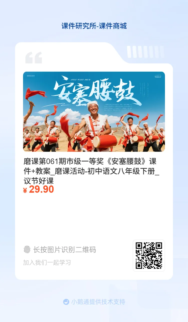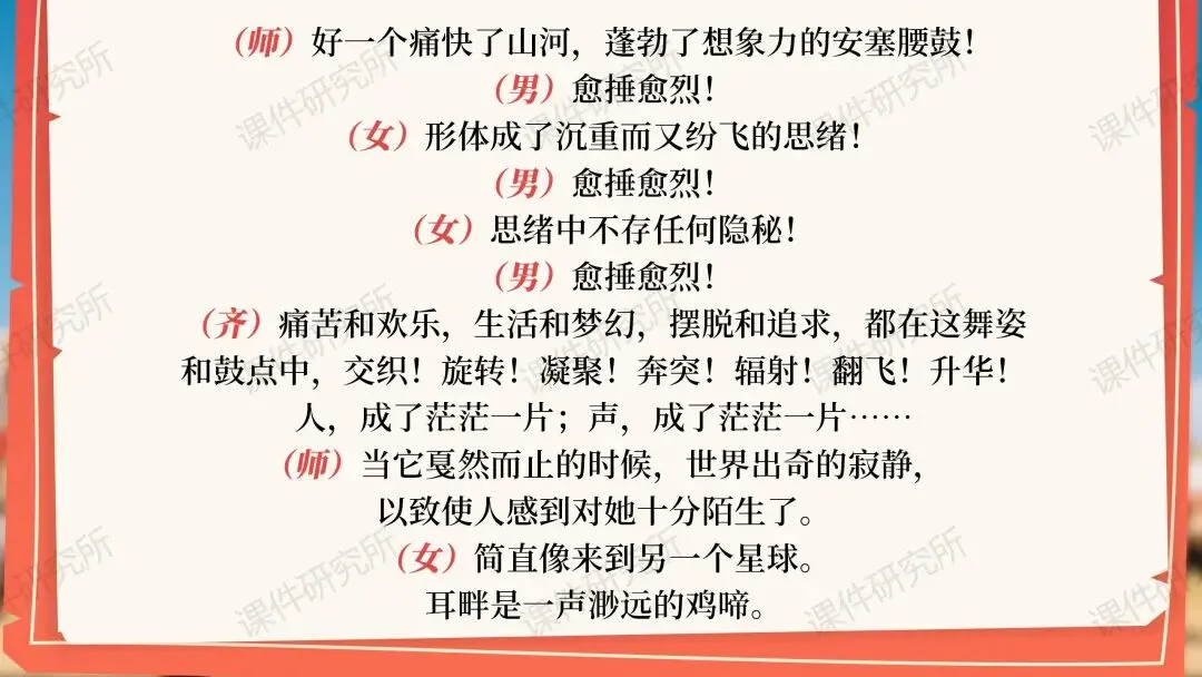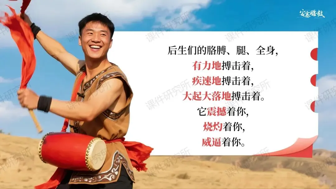 今天要分享的是一个市级优质课一等奖课件《安塞腰鼓》。磨课老师在比赛前一天才抽到课题,只有24小时准备时间,非常紧迫,但是炸鸡老师本身教学功底就非常深厚,原本的课件思路没有太大的问题。群里的老师们非常积极得给出了很多建议。要上这节公开课的老师们也可以参考一下: