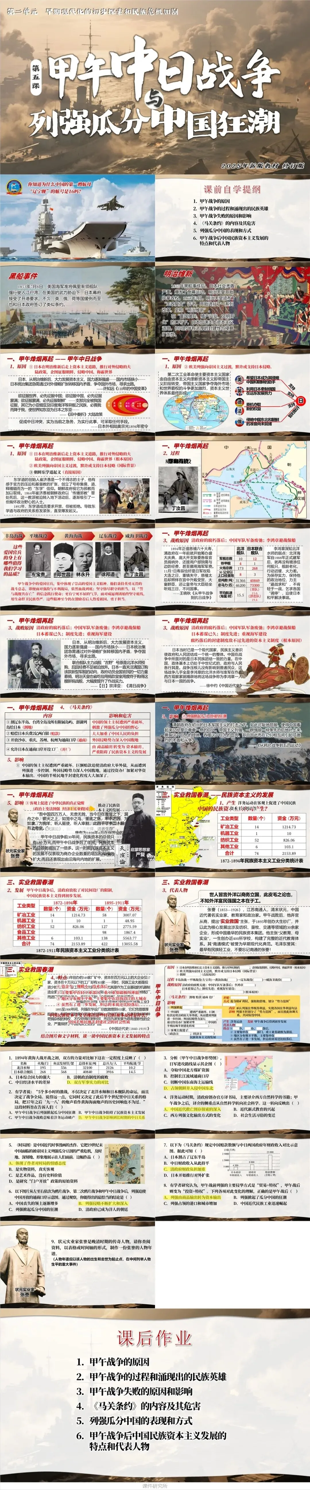 课件紧扣 “19 世纪末中国半殖民地社会深化” 的历史背景,以甲午中日战争为枢纽,构建 “原因 — 进程 — 结果 — 连锁影响 — 民族觉醒” 的完整逻辑链条,层层递进呈现历史脉络~
