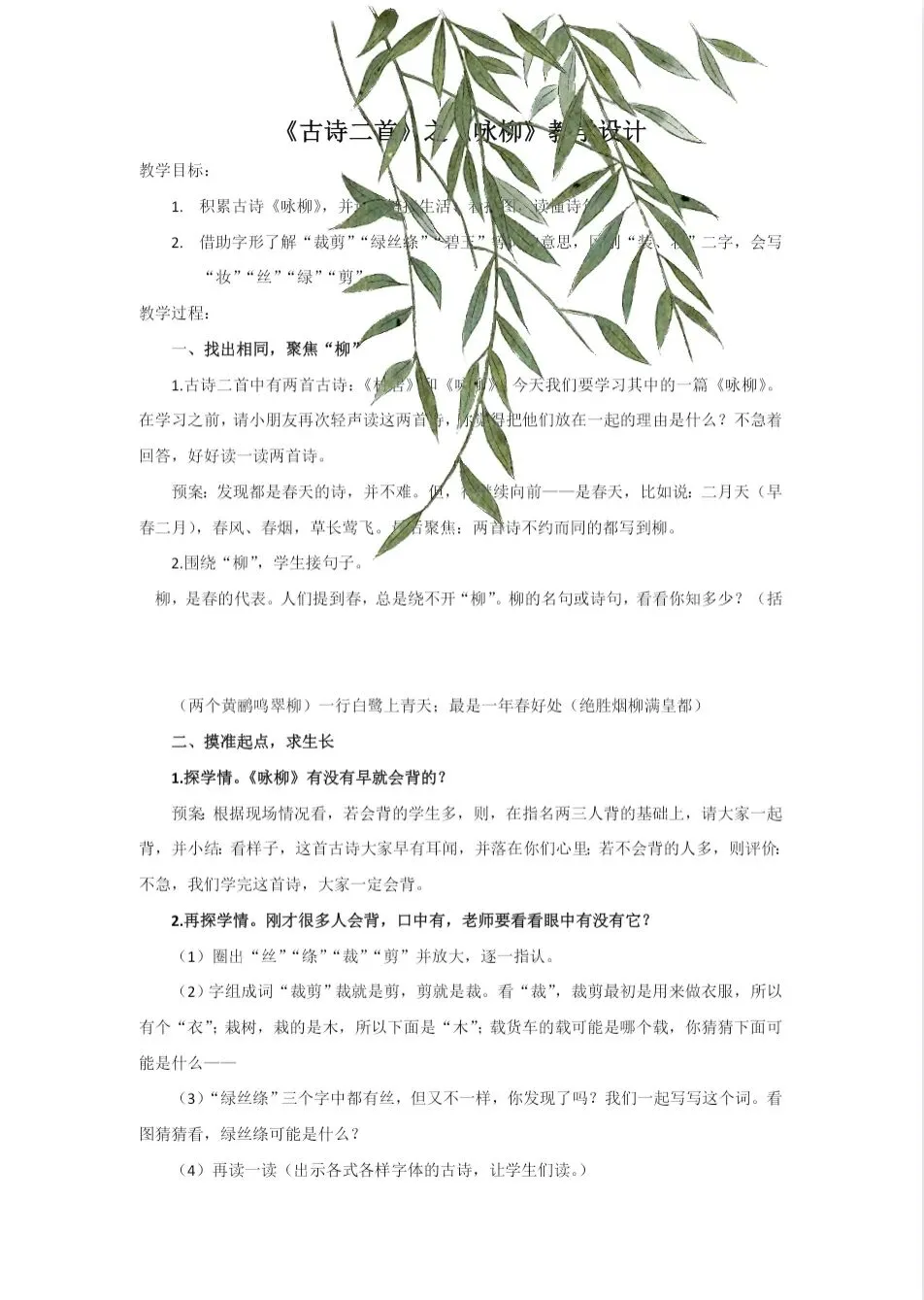 1. 积累古诗《咏柳》,并通过链接生活、看插图,读懂诗句。