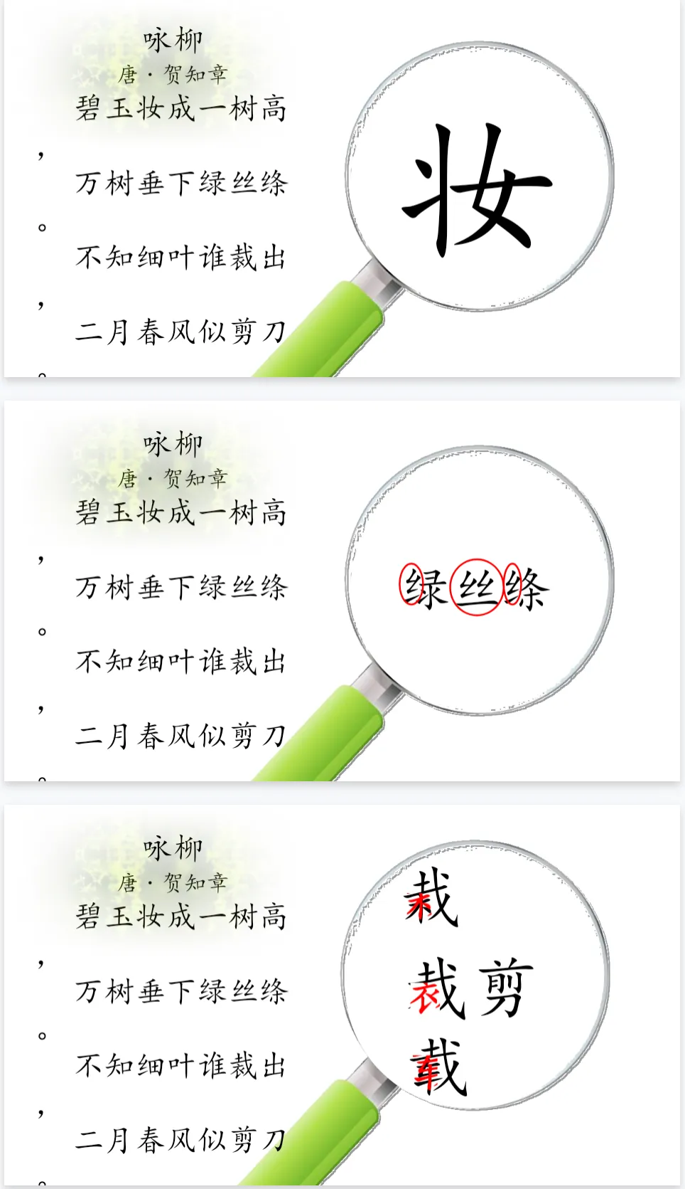 2. 借助字形了解“裁剪”“绿丝绦”“碧玉”等词的意思,区别“装、妆”二字,会写“妆”“丝”“绿”“剪”。