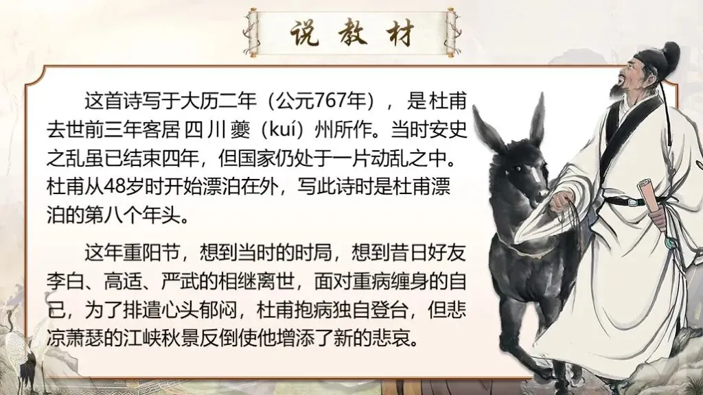 《登高》作为杜甫的代表作之一,被誉为 “古今七言律诗第一”,在古典诗歌史上具有极高的地位。它不仅是杜甫诗歌沉郁顿挫风格的典型体现,更是中国古代文人忧国忧民情怀的集中展现。