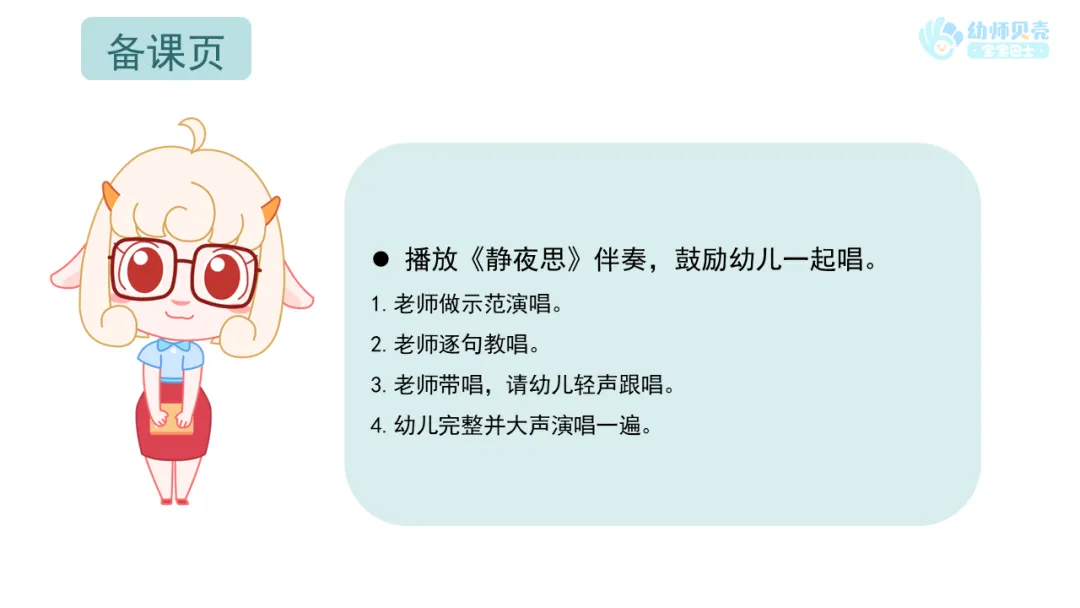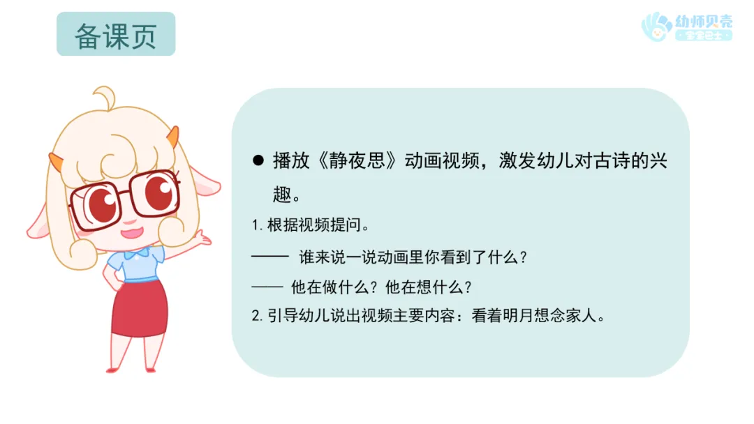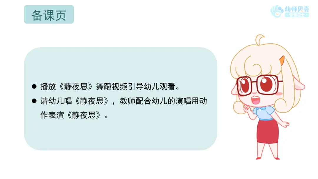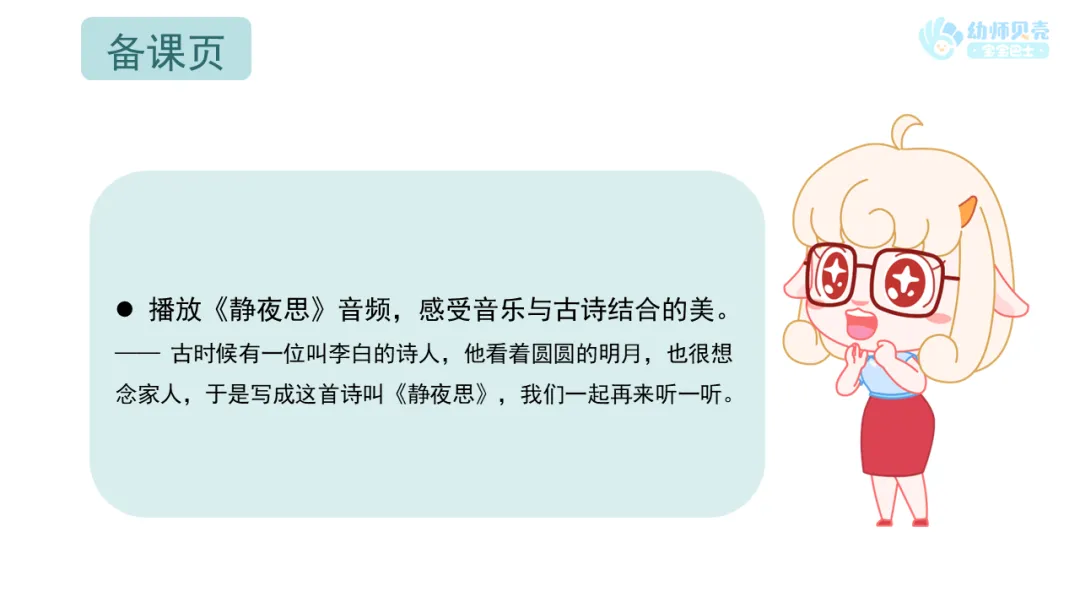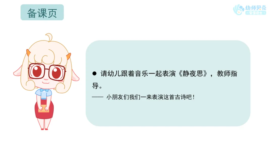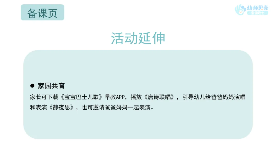 l家园共育:家长可下载《宝宝巴士儿歌》早教APP,播放《唐诗联唱》,引导幼儿给爸爸妈妈演唱和表演《静夜思》,也可邀请爸爸妈妈一起表演。