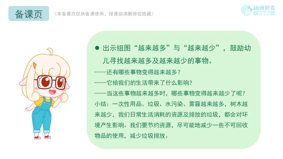 l出示图片“越来越多和越来越少”,引导幼儿初步理解节约资源的意义。