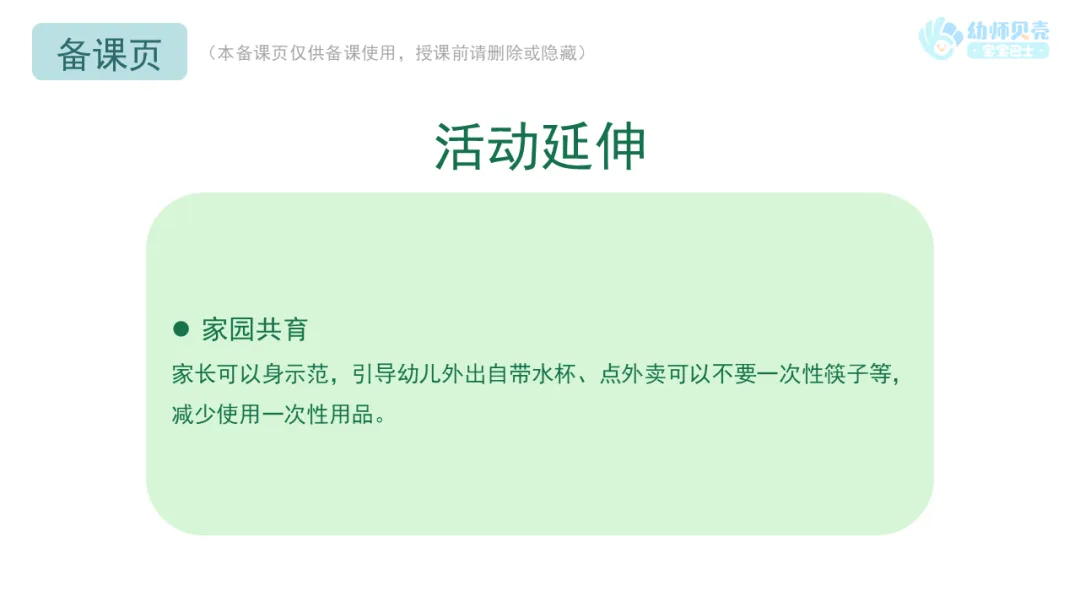 家长可以身示范,引导幼儿外出自带水杯、点外卖可以不要一次性筷子等,减少使用一次性用品。