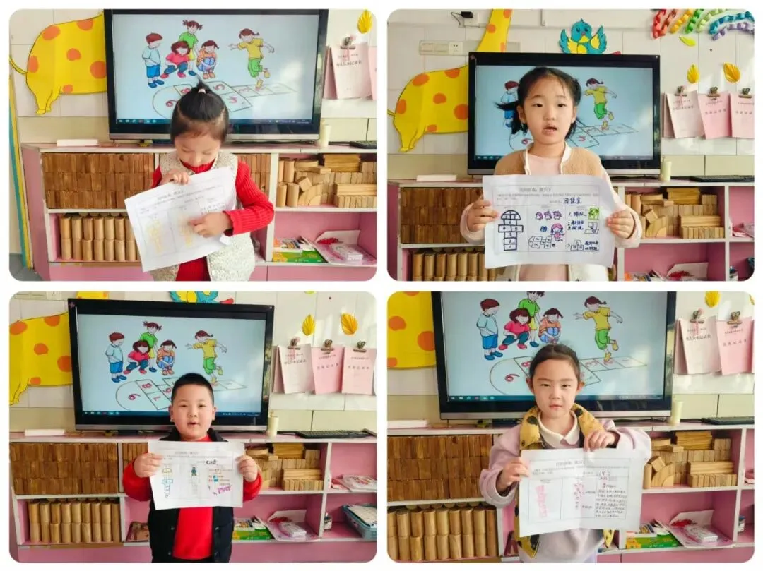 带着“跳房子到底是什么”的好奇,老师把这场“民间游戏探秘”变成了“亲子小任务”:周末里,孩子们跟着爸爸妈妈找跳房子、画跳房子——有的蹲在小区空地,用粉笔复刻出“格子地图”;有的把公园的跳房子画成了“带滑梯的彩色城堡”;还有的用积木搭出了立体的“跳房子楼房”。周一的教室成了“跳房子画展”,每一幅画里,都藏着孩子眼里独有的“游戏模样”。