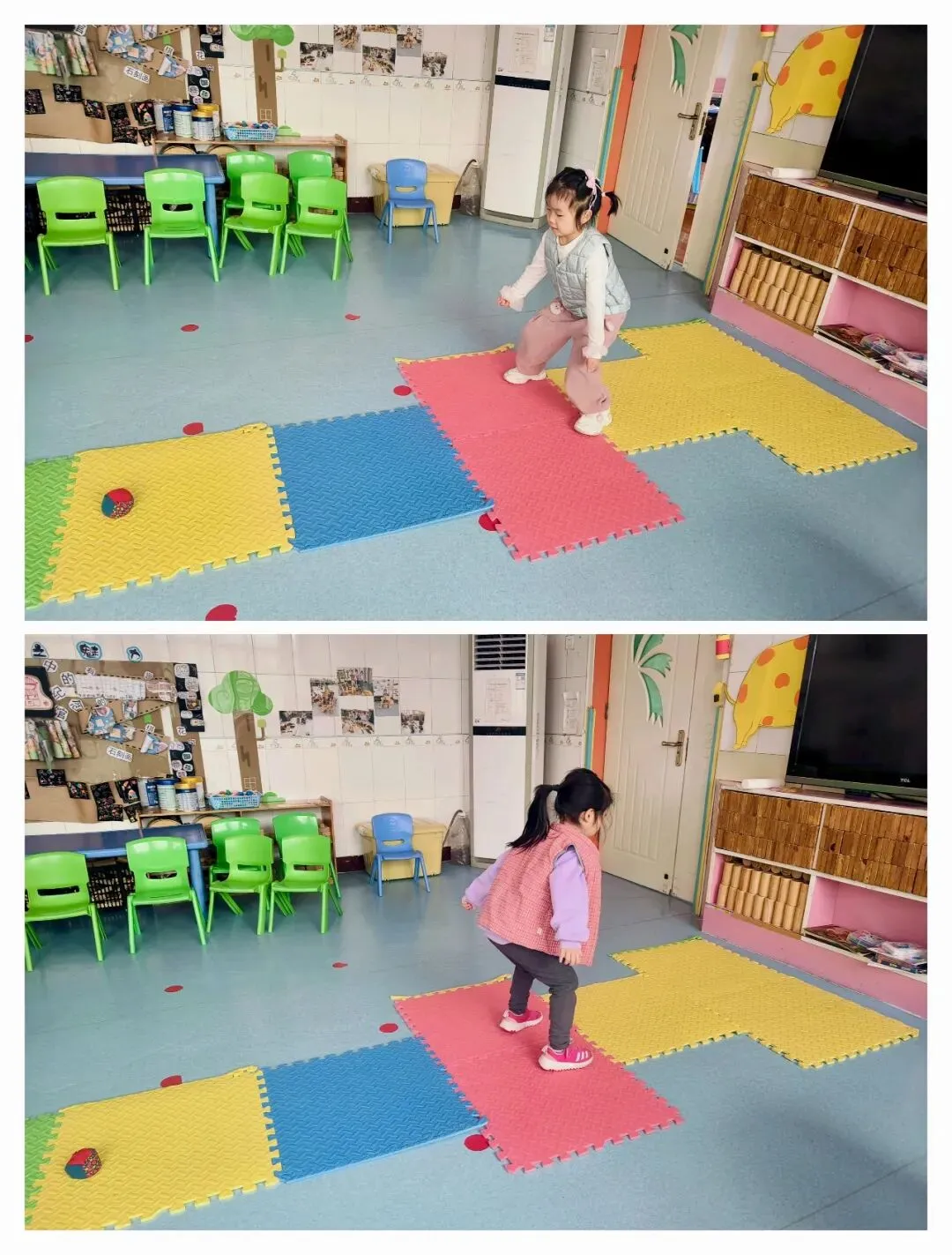 于是教室变成了“材料实验室”:呼啦圈摆成“圆圈房子”,轮胎堆成“阶梯房子”,彩绳拉成“迷宫房子”……孩子们跳着自己设计的新格子,笑声裹着创意,把老游戏跳出了新花样。