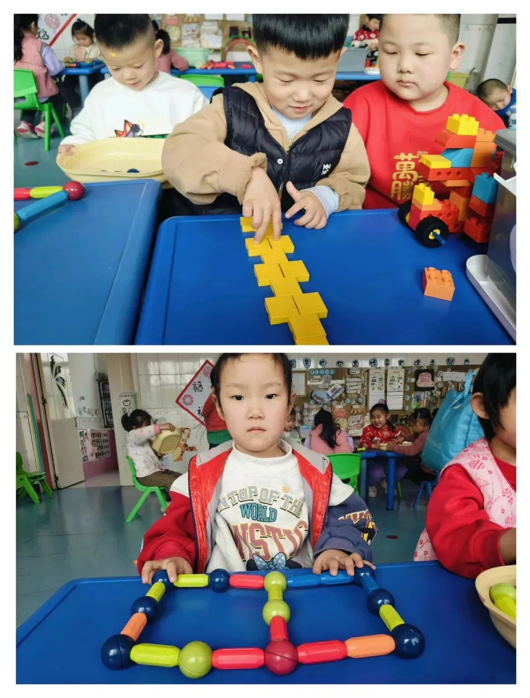 还有的翻出彩绳和积木:“我们搭个会变形状的跳房子吧!”