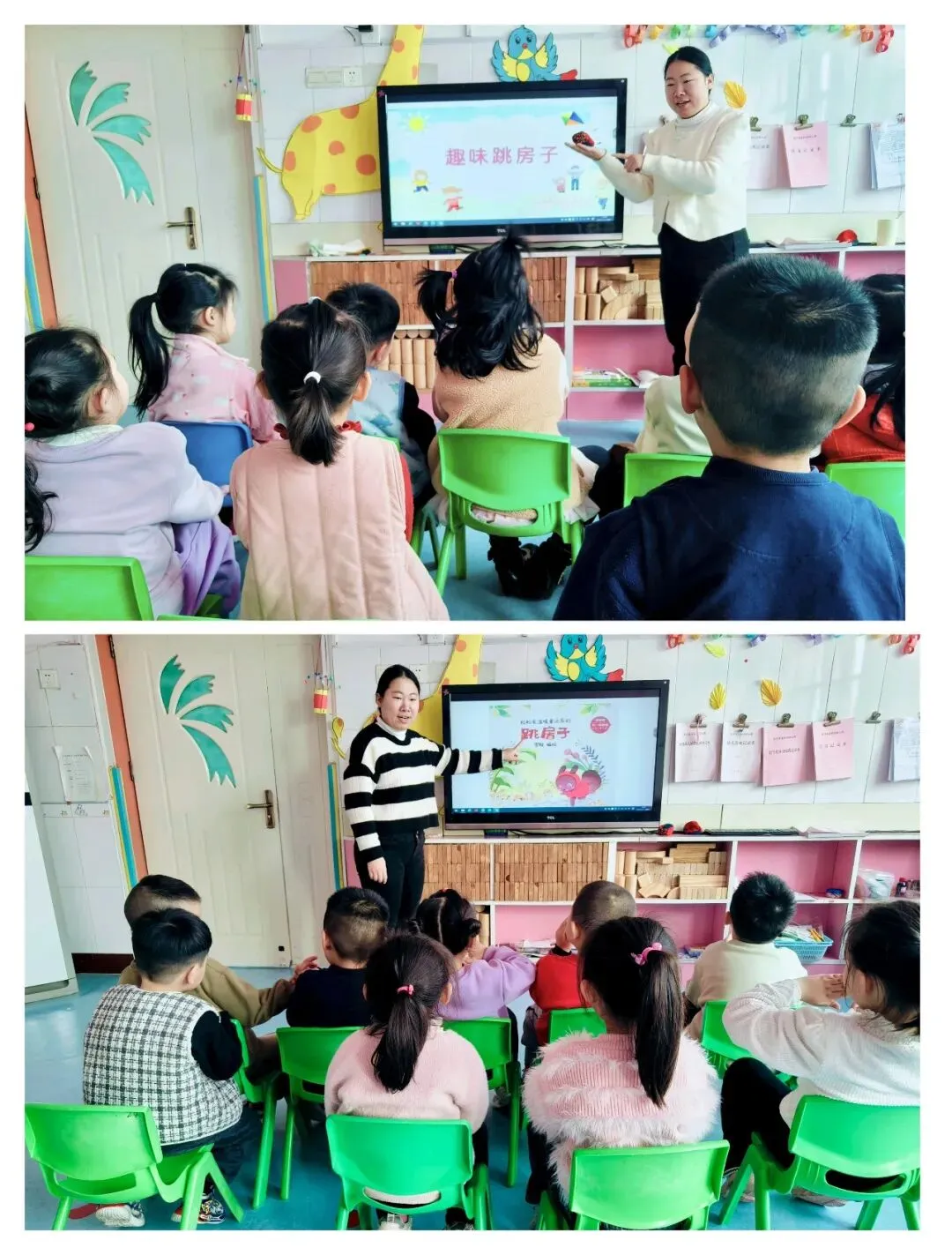老师的问题刚落,佳宜指着窗外的居民楼眼睛发亮:“跳房子是我家住的楼房!一层一层往上跳!”萌萌晃着羊角辫补充:“公园地上有彩色格子,爸爸说要单脚往前跳,不能踩线!”孩子们七嘴八舌的答案,像一颗小种子,在教室里种出了关于“跳房子”的探索故事。