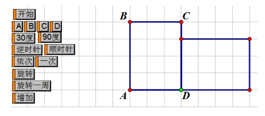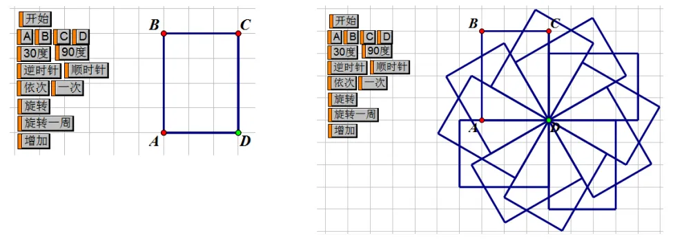 点击“一次”按钮,选中长方形ABCD,双击点E作为旋转中心,点击【变换】→【旋转】,旋转角度选择“一次旋转角度”。