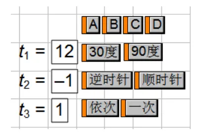 依次选中“t1”和“t4”设置移动按钮,移动速度改为“高速”,标签改为“30度”。依次选中“t1”和“t5”设置移动按钮,移动速度改为“高速”,标签改为“90度”。