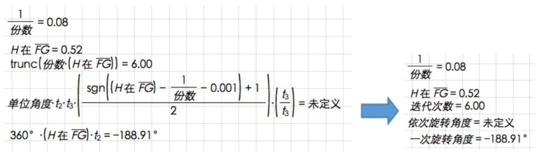 点击【数据】→【计算】,编辑得到公式“trunc(t1)”,标签改为“份数”。同上步骤,编辑得到公式“360°/份数”,标签改为“单位角度”。