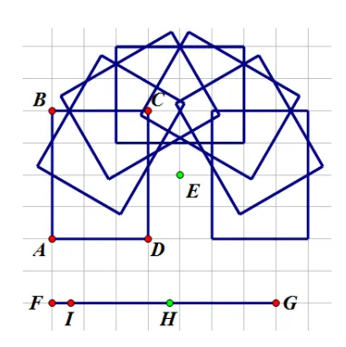移动点H到拉杆的中央,点击“依次”按钮,选中长方形ABCD,双击点E作为旋转中心,点击【变换】→【旋转】,旋转角度选择“依次旋转角度”,得到长方形A'B'C'D'。选中点A、B、C、D和公式“迭代次数”,按住“shift”,点击【变换】→【深度迭代】,初象选中点A'、B'、C'、D',得到依次旋转的图形。隐藏点A'、B'、C'、D'。如图2-7-9。