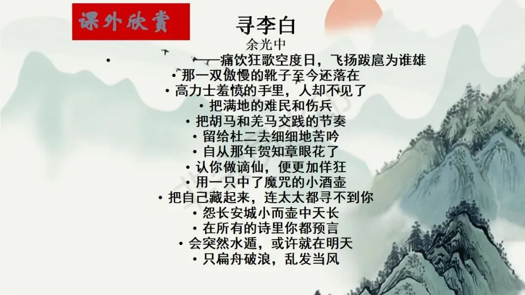 小编是正在努力的、热爱语文教学的一线语文教师,公众号所发布的教学资源,都是小编上课使用的,欢迎大家批评指正;教学课件内容有我们教研组集体备课的内容结晶,也有部分借鉴了名师的构思和创造,由于涉及面广,没能注明出处,敬请原谅,如有侵权,请联系小编删除;所发资源尽管参考了不少资料,但绝不照抄照搬某一资料,任何一个教学资源都是小编亲身授课使用的,可以直接用于教学。