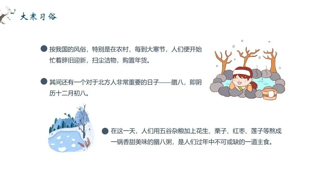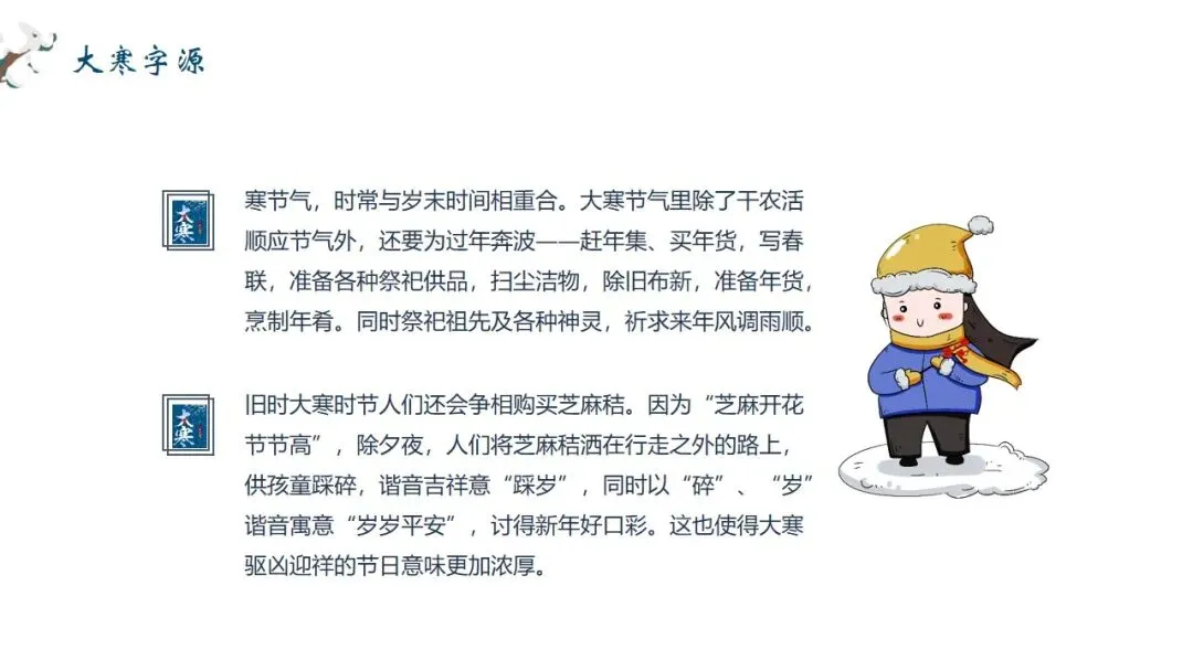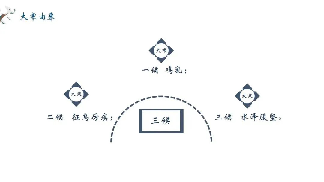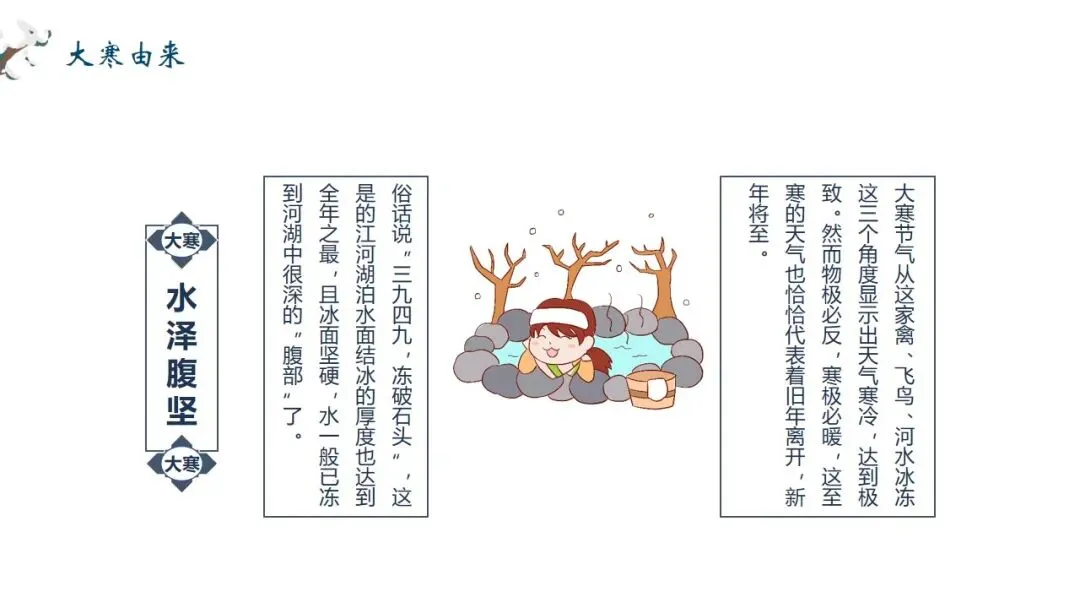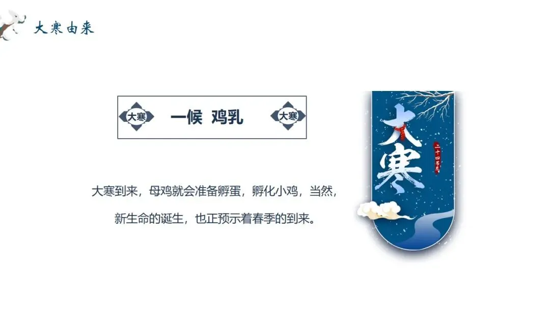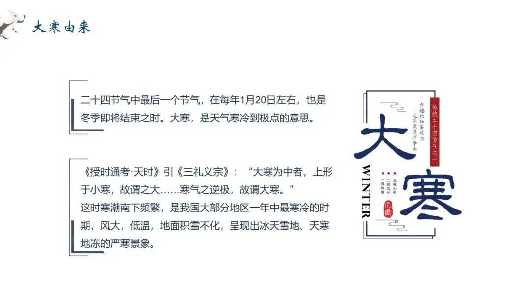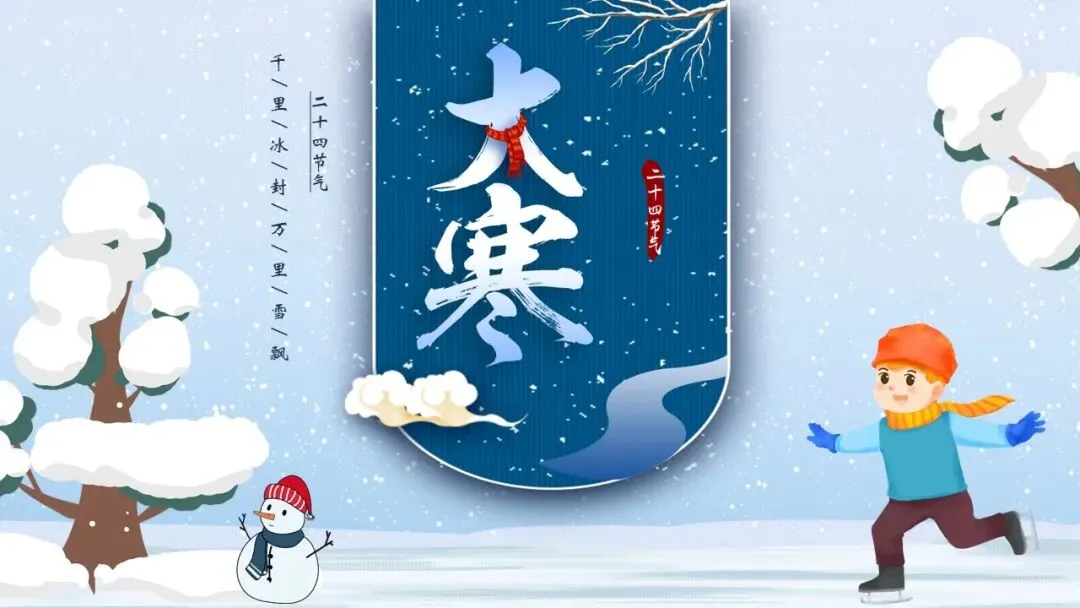 大寒是二十四节气中最后一个节气,每年公历1月20-21日太阳到达黄经300°时为“大寒”。《授时通考·天时》引《三礼义宗》解释道:“大寒为中者,上形于小寒,故谓之大……寒气之逆极,故谓大寒。”极言大寒之冷。这个节气处在三九、四九时段,此时寒潮南下频繁,是一年中的最寒冷时节,也是一年中雨水最少的时期。民谚云:“小寒大寒,无风自寒。”大寒,是天气寒冷到极点的意思。它是一个生机潜伏、万物蛰藏的时令