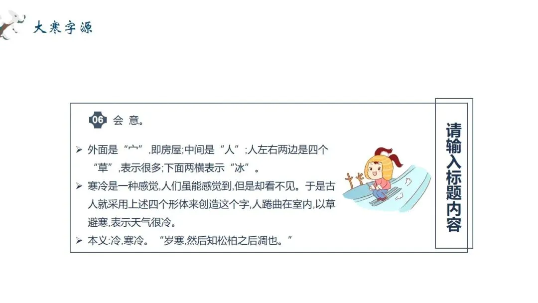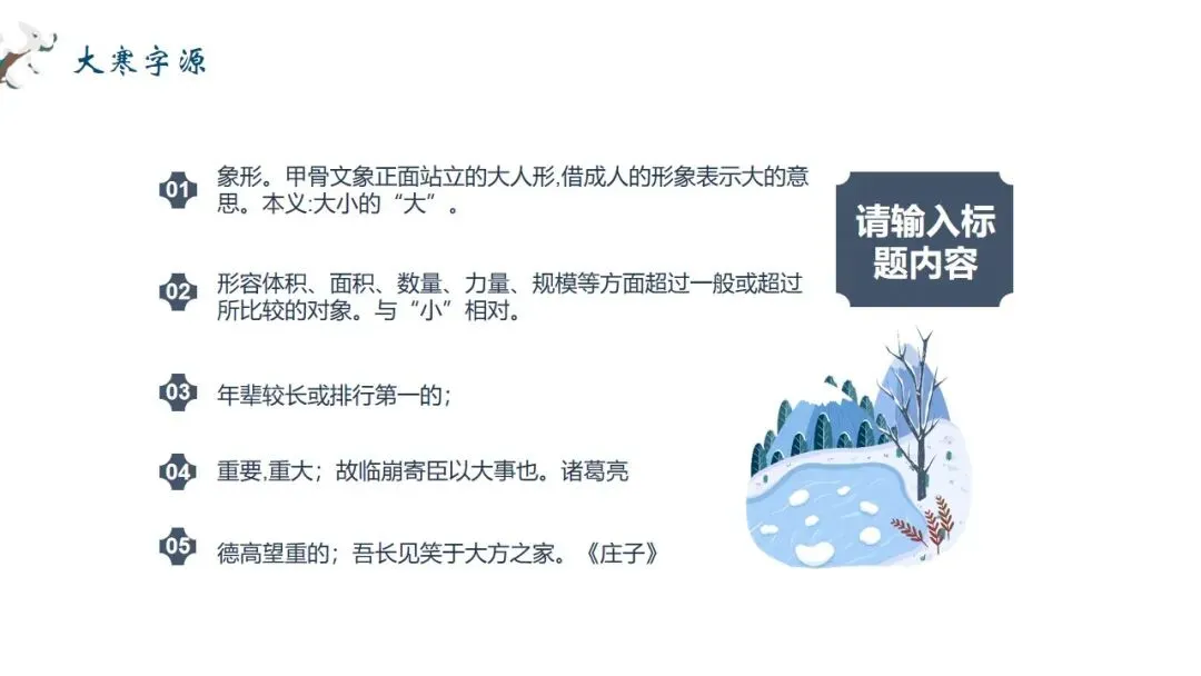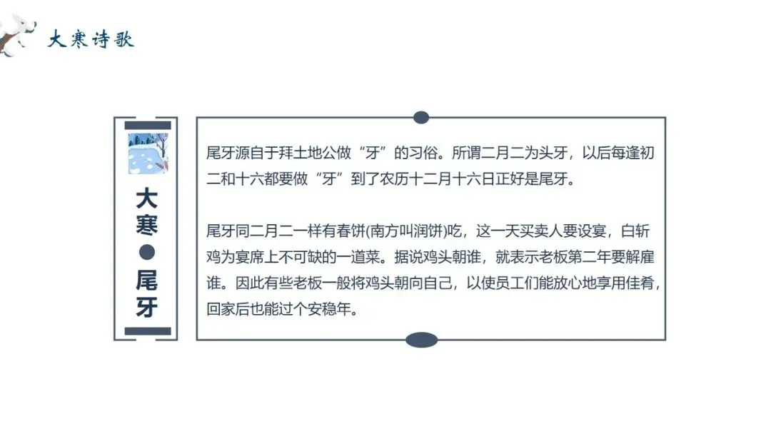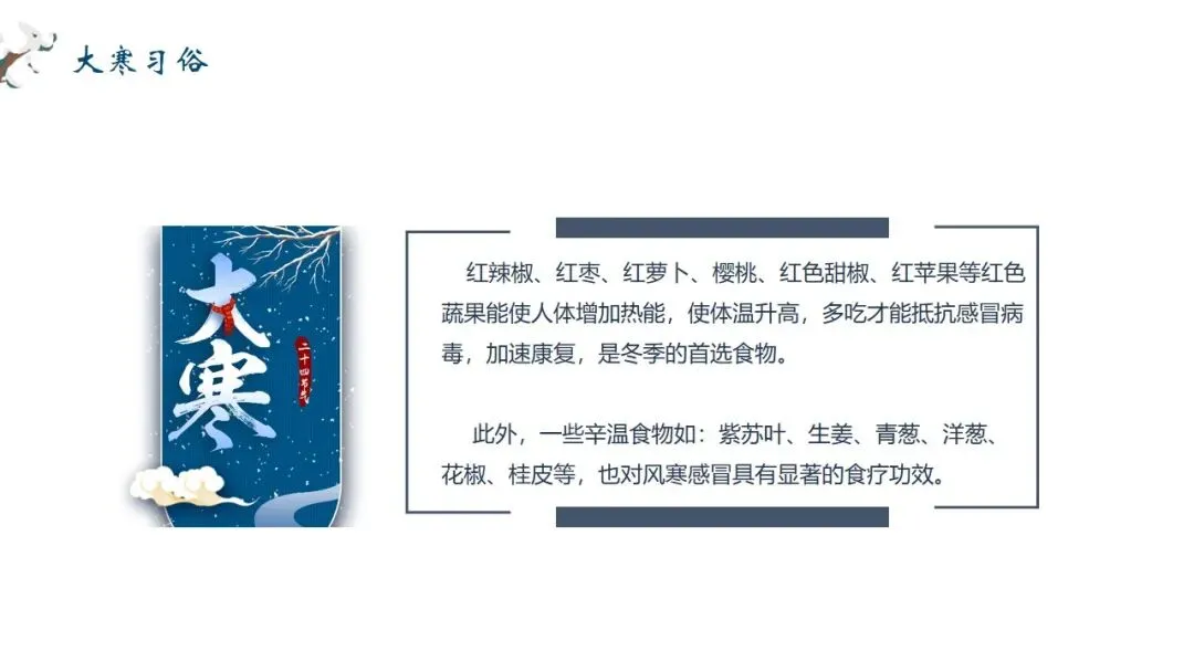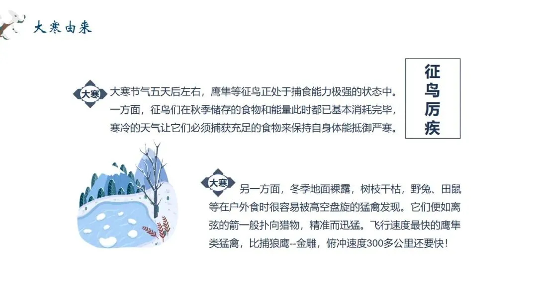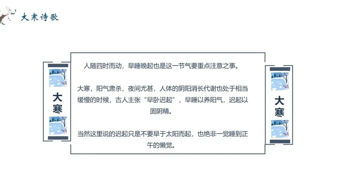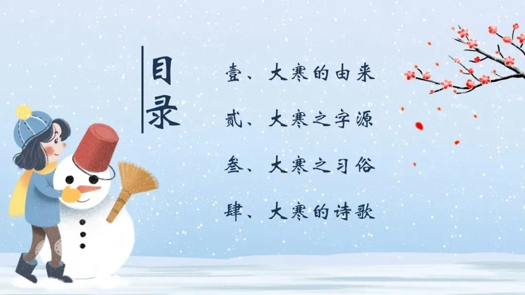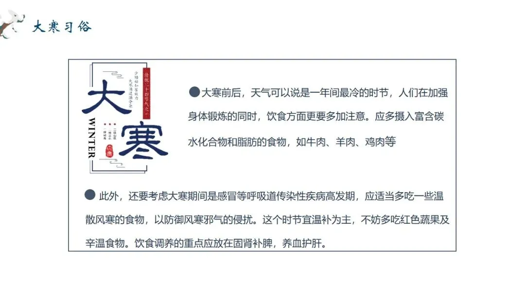 大寒是二十四节气中最后一个节气,每年公历1月20-21日太阳到达黄经300°时为“大寒”。《授时通考·天时》引《三礼义宗》解释道:“大寒为中者,上形于小寒,故谓之大……寒气之逆极,故谓大寒。”极言大寒之冷。这个节气处在三九、四九时段,此时寒潮南下频繁,是一年中的最寒冷时节,也是一年中雨水最少的时期。民谚云:“小寒大寒,无风自寒。”大寒,是天气寒冷到极点的意思。它是一个生机潜伏、万物蛰藏的时令