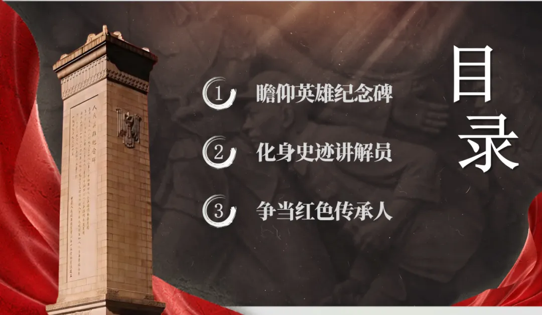 教师:学习红色文化,传承革命精神。今天我们班要去瞻仰“人民英雄纪念碑”来重现那段激情燃烧、充满血泪与牺牲的岁月,并化身史迹讲解员,参照课文内容对人民英雄纪念碑进行解说。