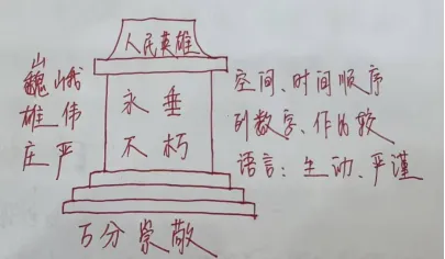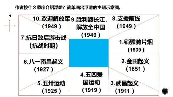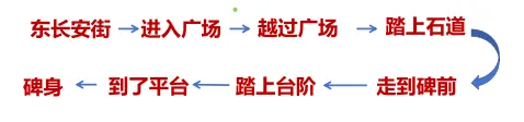 明确:按照下—上—下、正面—背面、四周—中间的空间顺序介绍纪念碑。