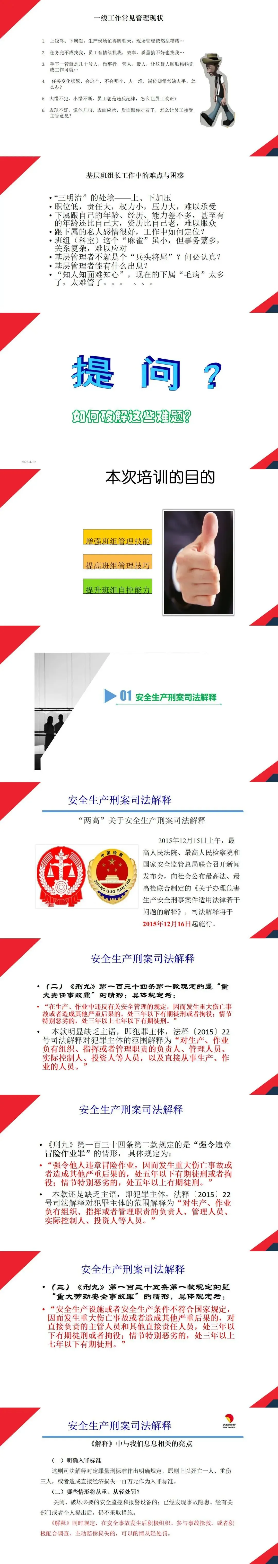 本文件是聚焦班组长岗位履职能力提升的专项培训课件,涵盖一线管理现状、法律风险、岗位职责、管理素质、安全管理方法及现场实操等核心内容,适用于企业班组长、基层管理人员及相关培训人员,是解决班组管理难题、明确安全责任、提升班组管理效能的重要指导性文件,对强化基层管理、防范生产安全事故具有关键意义。