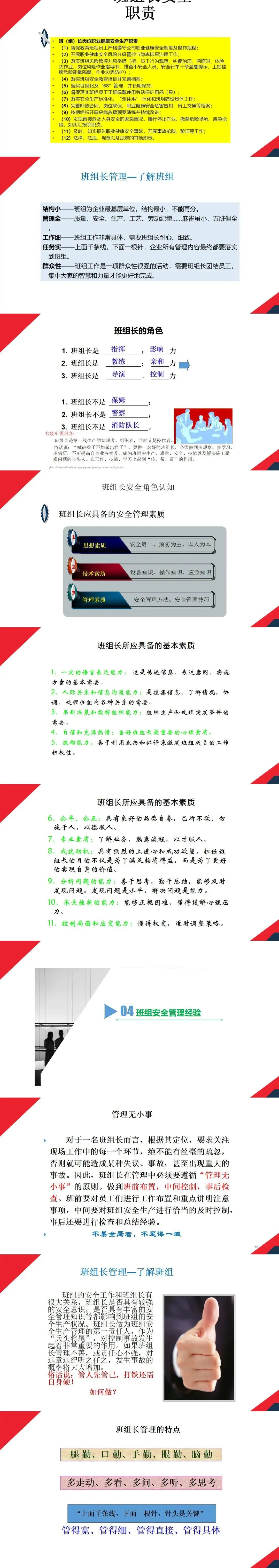 - 角色定位:是一线生产的管理者、组织者与操作者,需承担指挥、教练、导演的角色,具备指挥力、影响力、亲和力等,而非保姆、警察、消防队长的单一角色。