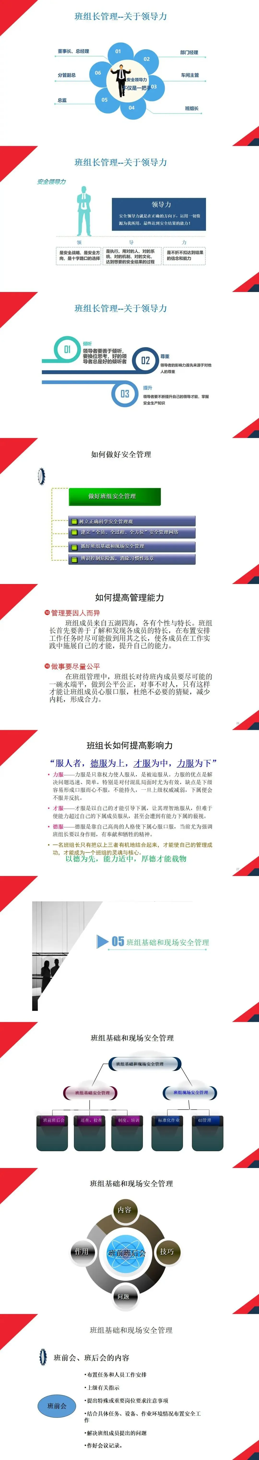 - 安全领导力:安全领导力是 “领(方向战略)、导(执行过程)、力(结果信念)” 的结合,需通过倾听、尊重、自我提升强化影响力,做到 “德服为上,才服为中,力服为下”。
