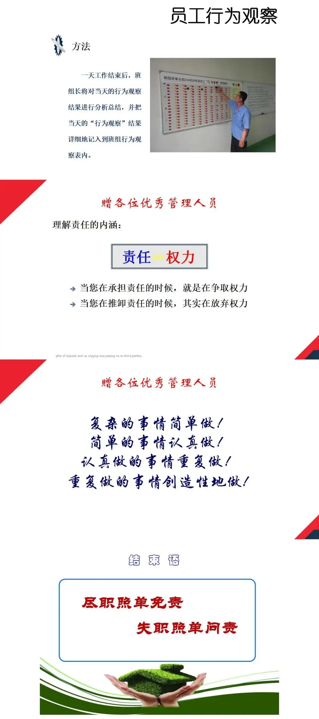 - 管理原则:遵循 “管理无小事”,做到班前布置、中间控制、事后检查;践行 “腿勤、口勤、手勤、眼勤、脑勤”,多走动、多看、多问、多听、多思考。