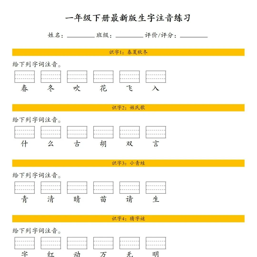 25年新版一年级语文下册《课文生字注音练习》,有答案,电子版可下载