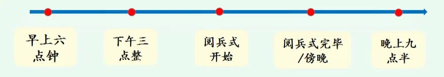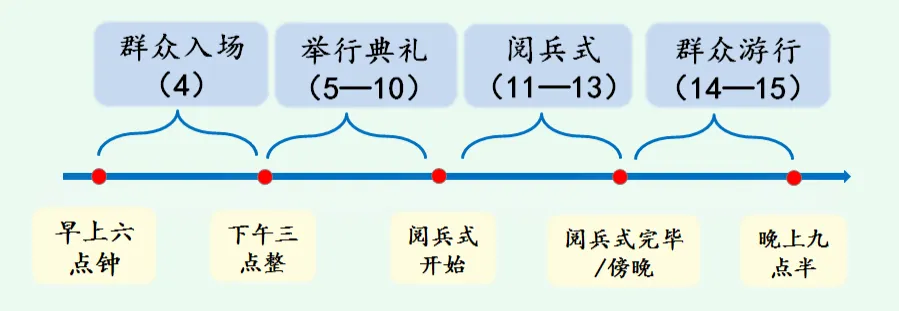 第一课时 【教学目标】 1.会写“政、府”等12个字,会写“政府、外宾”等19个词 语。 2.有感情地朗读课文,理解课文内容,厘清课文脉络。 3.明确“举行典礼”部分是如何点面结合写场面的。 【教学过程】 一、情境导入(出示课件3) 1.教师导入:同学们,你们知道是谁在什么地方升起了我们伟大的祖国的第一面五星红旗吗?我们的伟大领袖毛主席带领全国人民推翻了国民党的黑暗统治,建立了伟大的新中国。1949年10月1日,在北京举行了开国大典。伟大的中华人民共和国从此诞生了。 2.揭示课题《开国大典》,板书课题:开国大典,学生齐读课题。 二、初读课文,学习字词 1.初读课文(出示课件4) 教师提出要求:默读课文,读准字音,读通句子。体会新中国成立时人们自豪、激动的心情。 2.学习字词(出示课件5) 汇集预定爆发就位宣告雄伟肃静旗帜语调完毕检阅制服坦克一致距离高潮次序擎着瞻仰电钮排山倒海 指名读词语,注意纠正字音,了解排山倒海的意思是形容力量强,声势大。 (出示课件6)学生明确本课要求会写的生字,教师引导学生关注容易写错的字,让学生相互提醒容易写错的部件和笔画。 指导:“宣”和“坦”最后一笔的横都要写得长一点儿,托住上面的部分,使整个字平稳匀称。(出示课件7) 三、再读课文,厘清结构 (出示课件8)教师提出问题:联系课文题目想一想,课文主要写了什么。 预设:庆祝中华人民共和国中央人民政府成立的隆重典礼。 (出示课件9)教师提出问题:快速浏览课文,思考课文围绕开国大典写了哪两部分内容。 预设:第1—3自然段写了开国大典的总体情况,4—15自然段写了开国大典的具体过程。 教师板书:总体情况具体过程 (设计意图:引导学生运厘清文章脉络,培养整体把握课文的能力。) 四、聚焦开国大典的总体情况 1.(出示课件10)教师提出自主学习要求:自由读课文第1—3自然段,说说你了解了开国大典的哪些总体情况。 2.学生自由读课文第1—3自然段,并圈画相关内容,教师巡视指导。 3.汇报交流(出示课件11) 预设1:举行开国大典的时间是1949年10月1日。 教师板书:时间 预设2:举行开国大典的地点是北京。 教师板书:地点 预设3:参加开国大典的,有中华人民共和国中央人民政府主席、副主席、各位委员,有中国人民政治协商会议全体代表,有工人、农民、学校师生、机关工作人员、城防部队,总数达三十万人。观礼台上还有外宾。 教师板书:参加人员 预设4:开国大典的会场在天安门广场,主席台设在天安门城楼上。 预设5:会场是这样布置的,城楼檐下,八盏大红灯笼分挂两边。靠着城楼左右两边的石栏,八面红旗迎风招展。 教师板书:会场的位置和布置 五、聚焦开国大典的具体过程 1.厘清时间节点(出示课件12) (1)教师提出自主学习要求:阅读课文第4—15自然段,圈出表示时间或标明时间节点的词语,整理到下面的时间轴上。 (2)学生阅读课文并尝试填写时间轴。 (3)师生交流,完成时间轴填写。