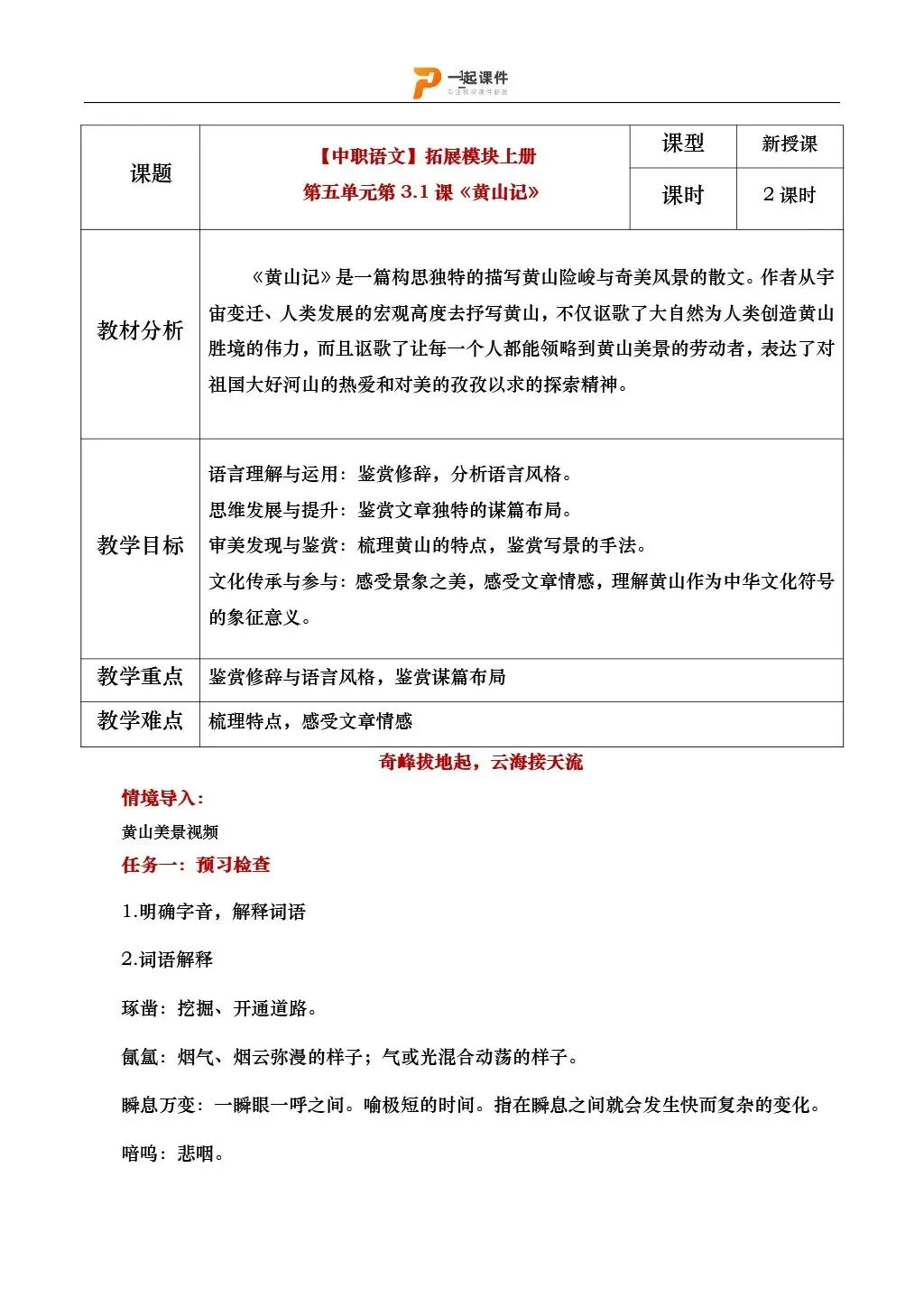 >【中职语文拓展模块上】| 《黄山记》:课件+教学设计