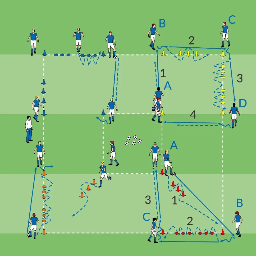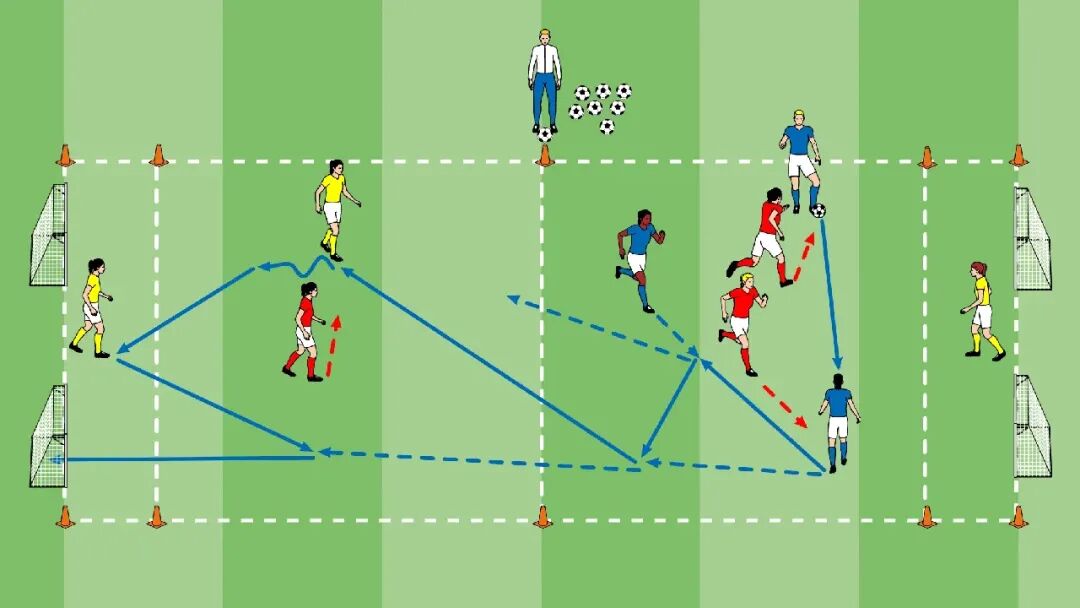 • 每1.5分钟后变化跑动任务(位置1)和传球方式(例如根据指令"转身!"或"拍手!"自由选择双重二过一或其他方式)