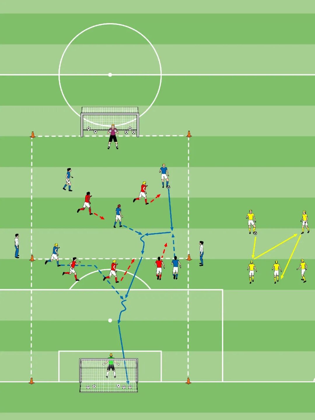 • 标记一个40x28米的场地,包括中线和2个带守门员的球门