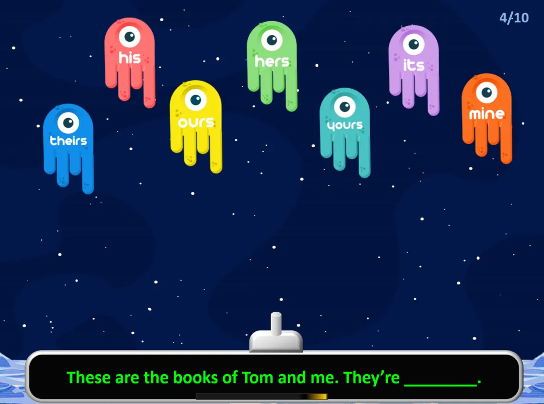 不用担心知识枯燥,游戏都是设计在PPT上的,操作简单,电脑打开,点击就行了。游戏界面设计一下子激发孩子学习兴趣。通过给出的句子,选出正确的人称代词所有格,消灭小怪兽成功,学起来非常有成就感!