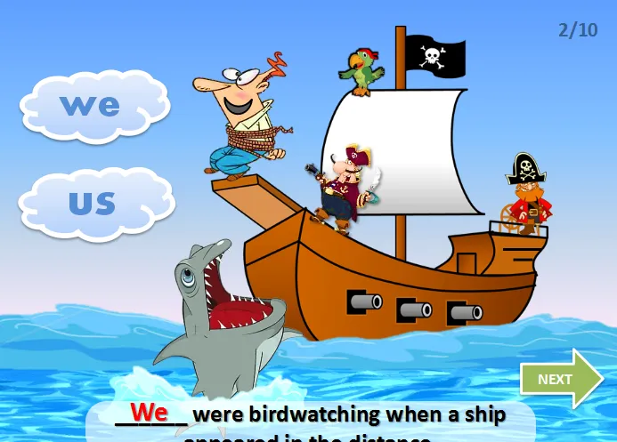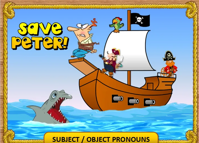 拯救彼得互动PPT:一套非常精彩的拯救主题PPT,故事很精彩,线索也突出。彼得被海盗抓住了,我们要拯救他。拯救的方式很简单,就是要选出正确的人称代词,海盗就会被扔到海里,彼得得救;否则,彼得就会掉到海里,被鲨鱼吃掉。