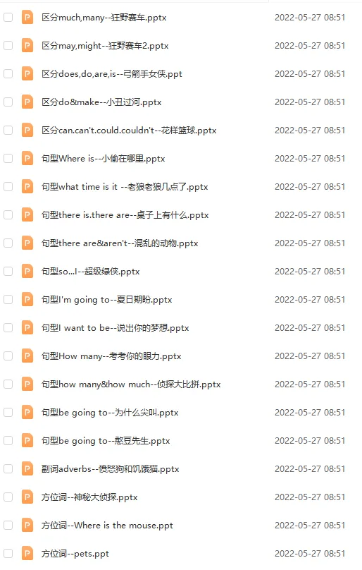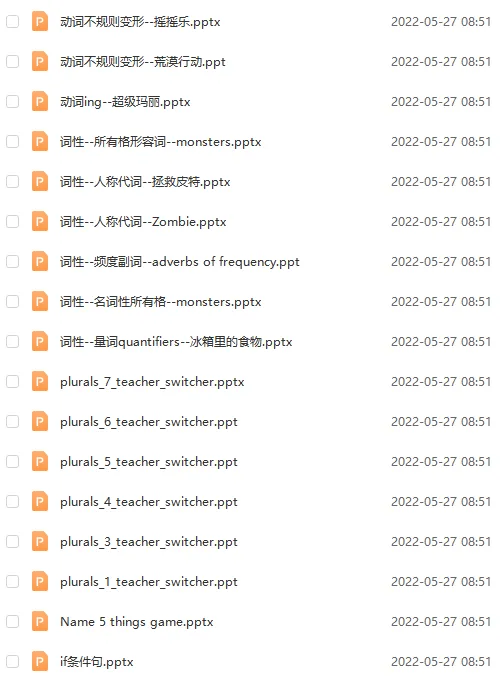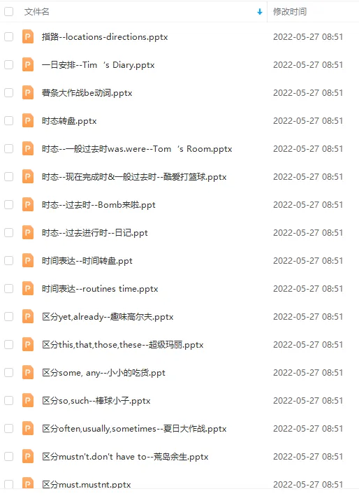 知识超级实用,54张PPT包括了词性、句型、时态等。比如你我他人称代词、各种名词单复数、few any much many各种量词、if条件从句、现在完成时、一般过去时……适合家长在家辅导,更适合课堂教学,简直就是神器!