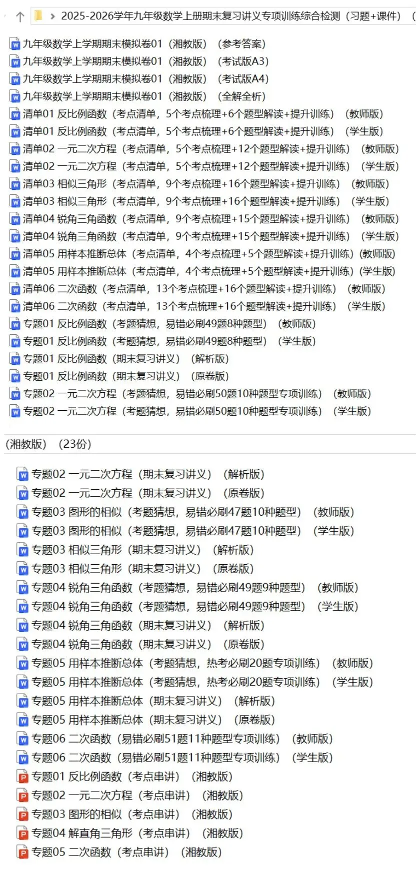 >2025年九上数学湘教版:期末复习讲义专项训练综合检测知识清单23份含答案解析 | 完整电子版文档可下载打印