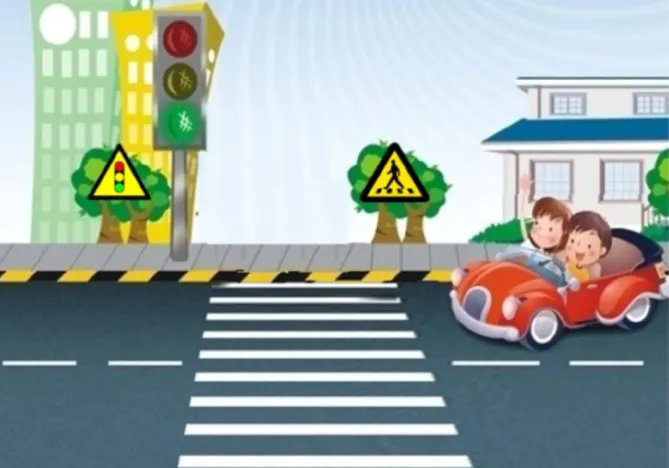 形象地感知交通常识——过马路要小心走斑马线,红灯停,绿灯行。