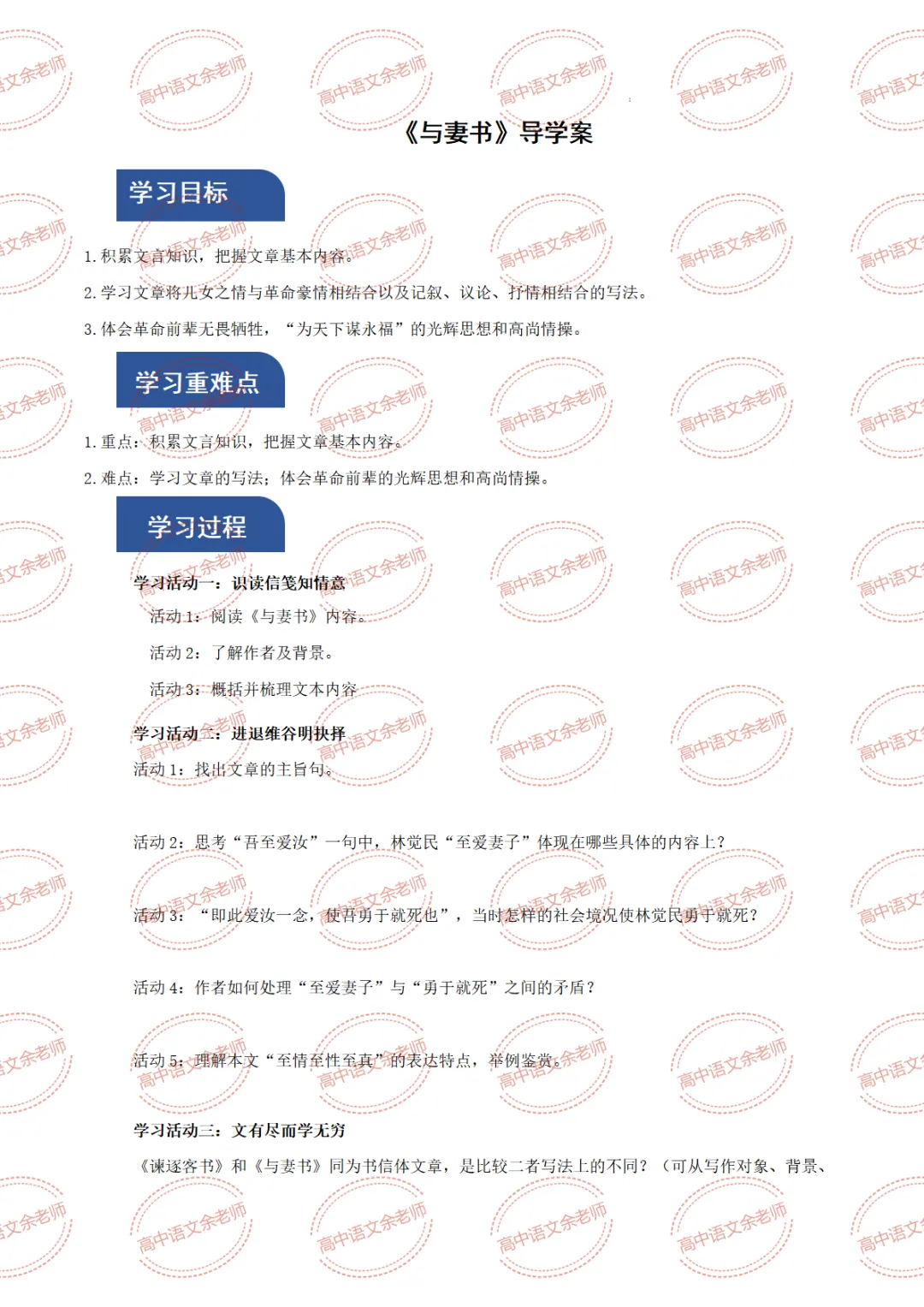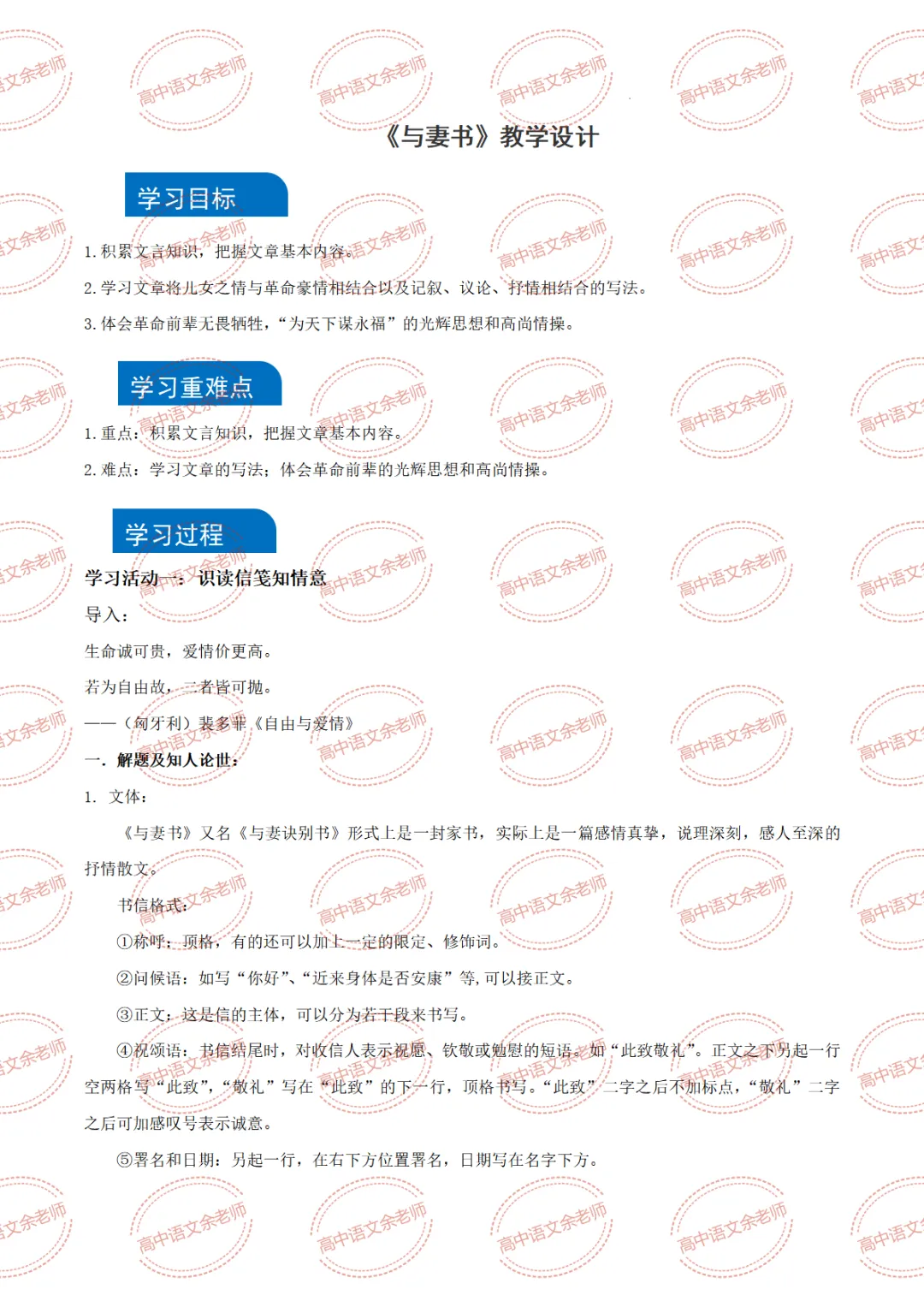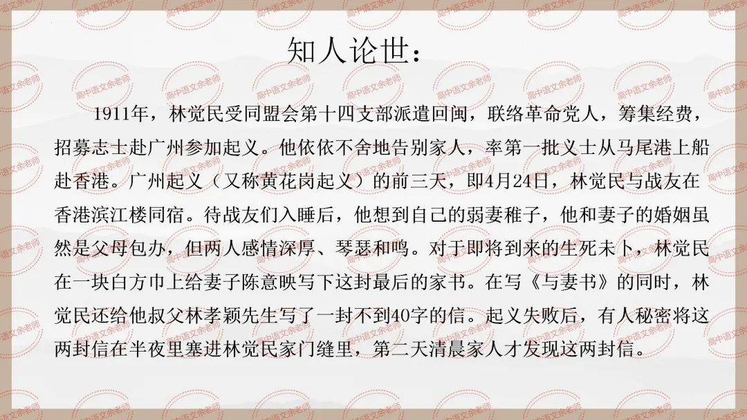 >《与妻书》教案设计及课件PPT 导学案 分层作业 【适配高中语文 必修下册】教师备课